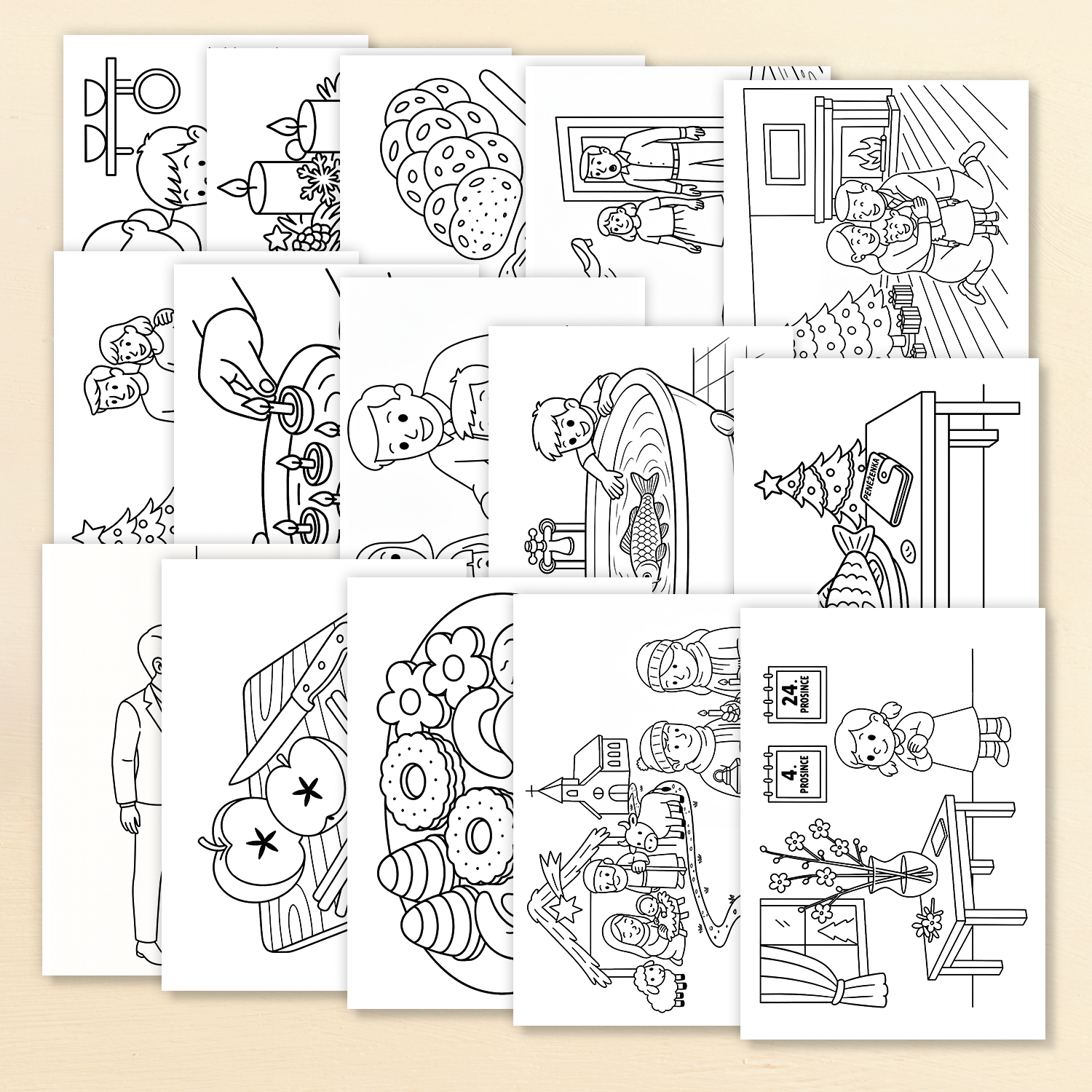 Originální sada omalovánek inspirovaná českými vánočními zvyky a oblíbenými svátečními motivy.