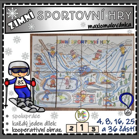 „ZIMNÍ SPORTOVNÍ HRY – maxiomalovánka“ je kooperativní výukový materiál, který propojuje výtvarnou činnost, spolupráci dětí a tematickou výuku se zaměřením na zimní sporty a sportoviště. Materiál je navržen tak, aby podporoval přirozenou spolupráci dětí, jejich zodpovědnost za vlastní práci a radost ze společného výsledku.