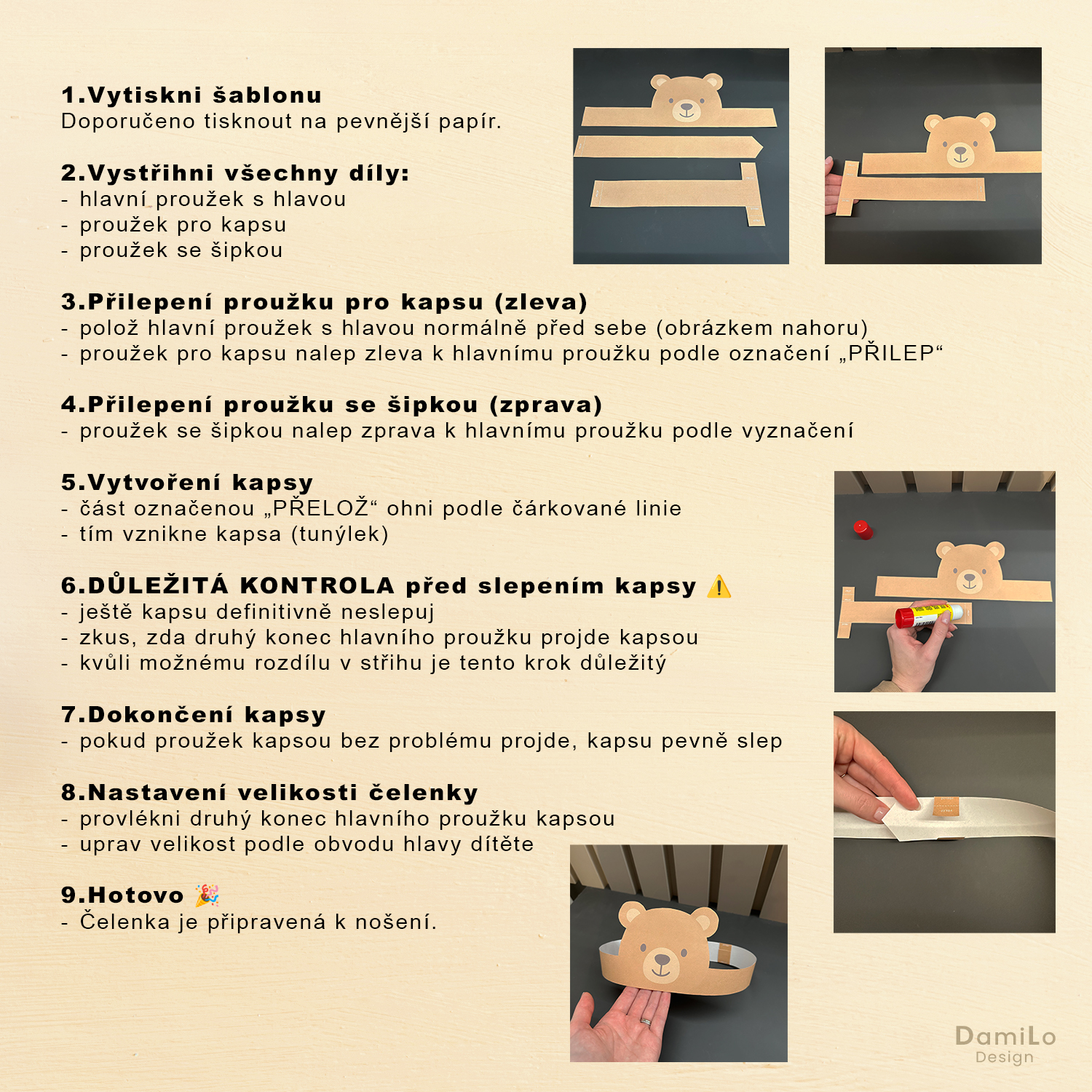 - přehledný návod k sestavení čelenek s ilustračními fotografiemi