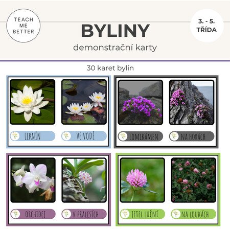 VYUŽITÍ: Využijte karty při pozorování přírody, třídění nebo hře „Poznej bylinu“, Použijte je jako demonstrační pomůcku na nástěnku nebo k práci ve skupinách.
