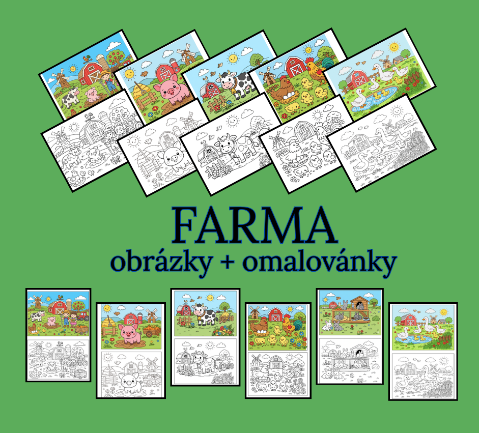 - celkem 18 stran (obrázky zvířátek z farmy v přirozeném prostředí + omalovánky s předlohou/bez předlohy)