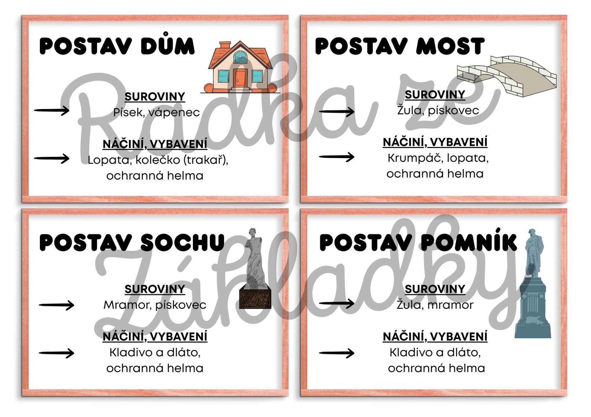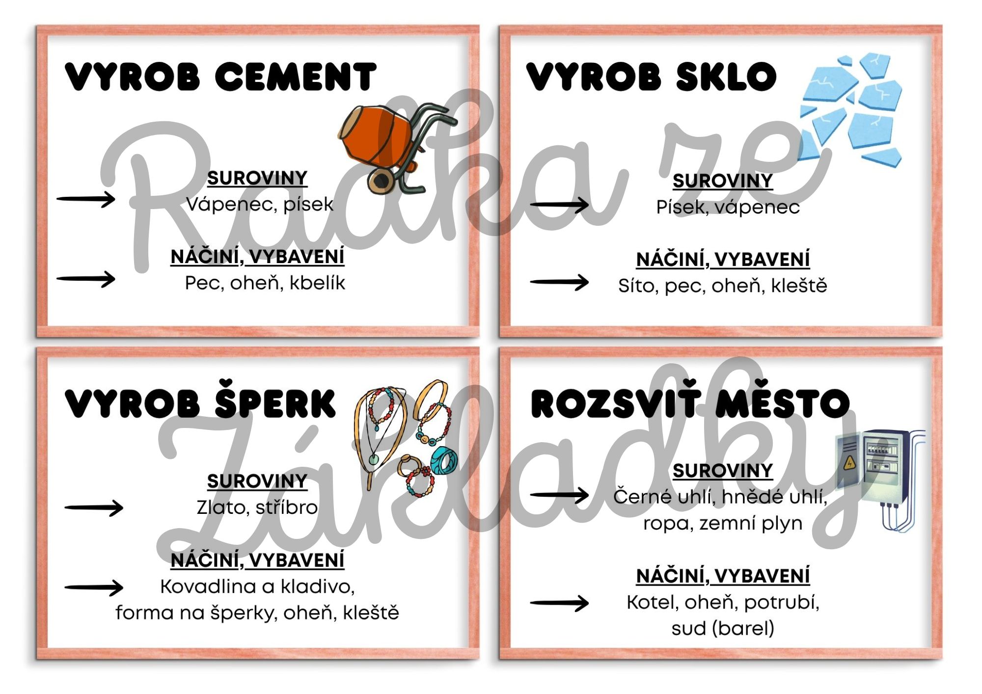Každá skupina nebo jednotlivec dostane svůj úkol (např. „Postav dům“, „Vyrob sklo“) a musí získat všechny potřebné suroviny a náčiní. Karty hráči získávají obchodováním s ostatními skupinami nebo losováním z třídního tržiště – hra tak rozvíjí nejen přírodovědné znalosti, ale i komunikační dovednosti, logické myšlení a strategii.