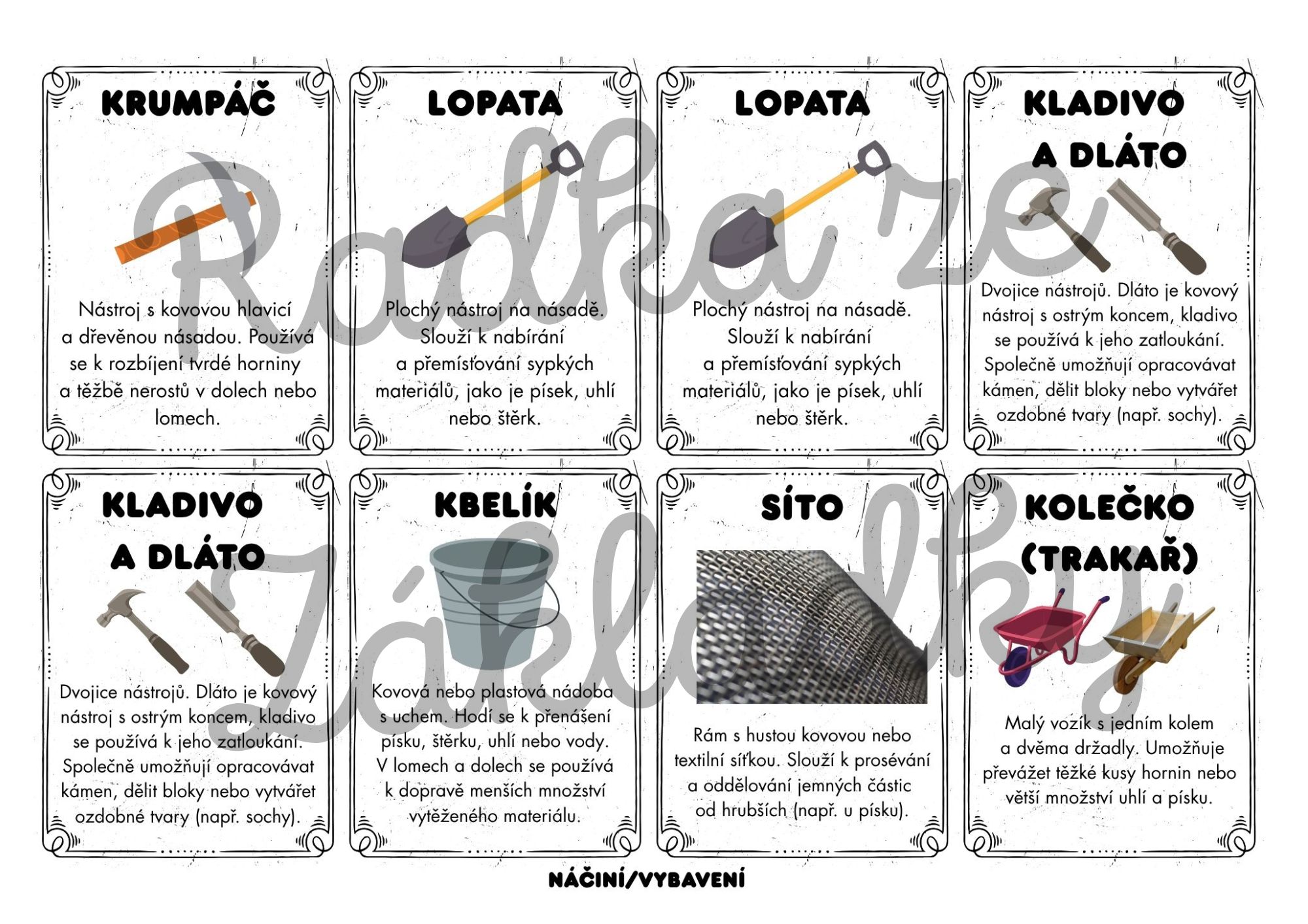 - 38 karet náčiní/vybavení: krumpáč, lopata, kladivo a dláto, kbelík, síto, kolečko (trakař), pec, oheň, kovadlina a kladivo, forma na šperky, kleště, hlubinný vrták, sud (barel), potrubí (trubky), ochranná helma, kotel.