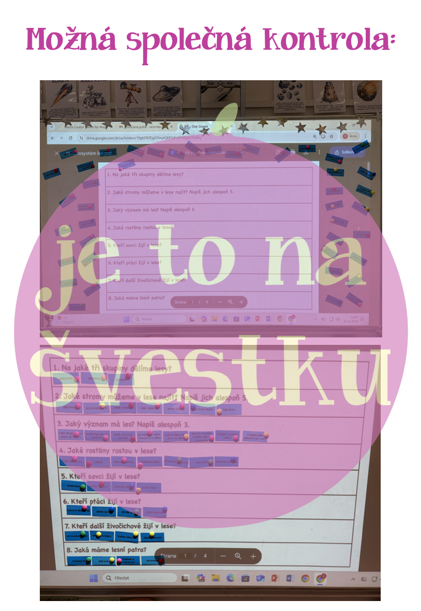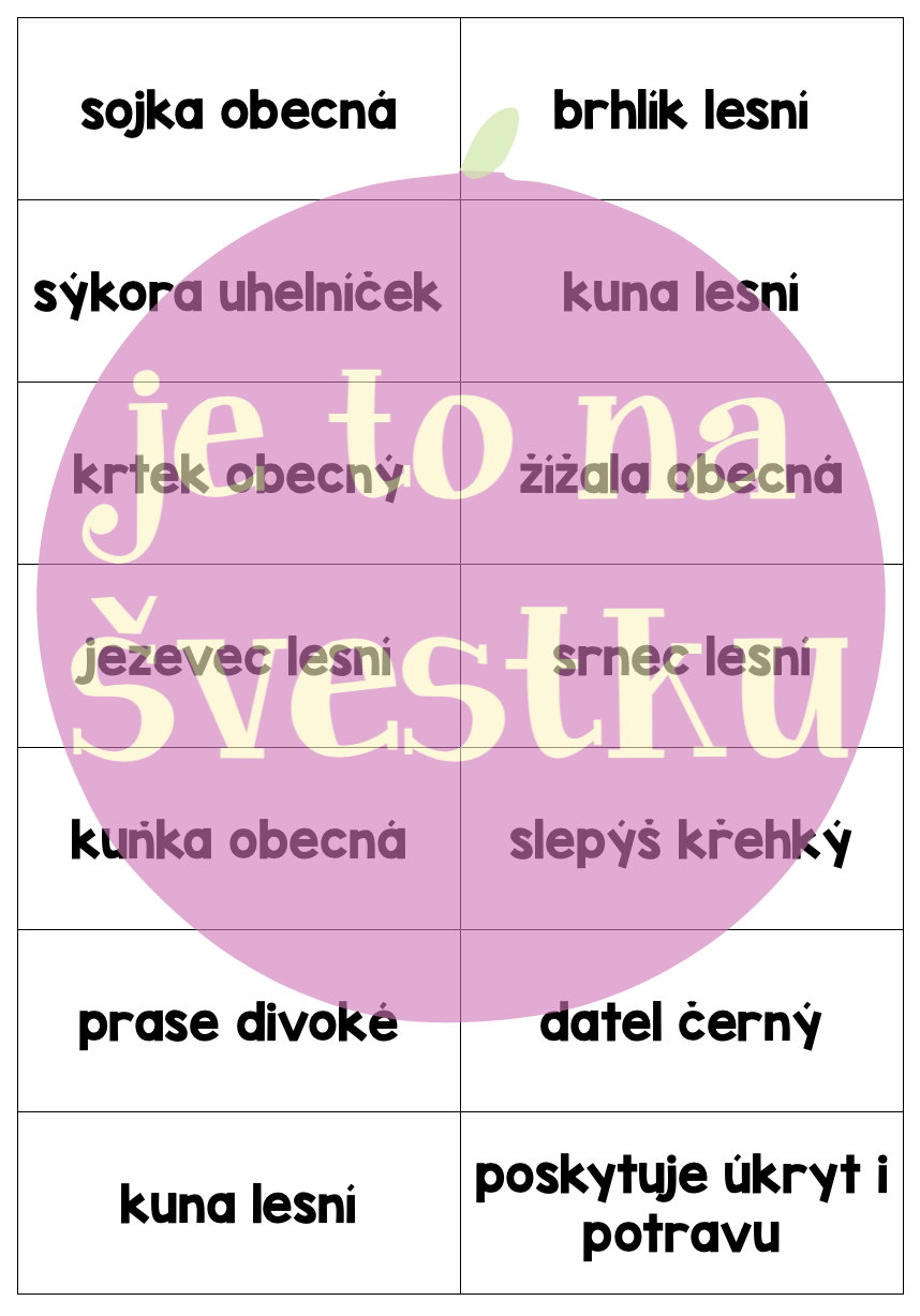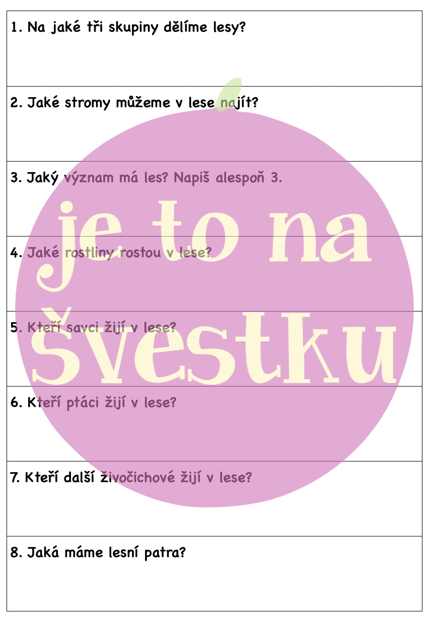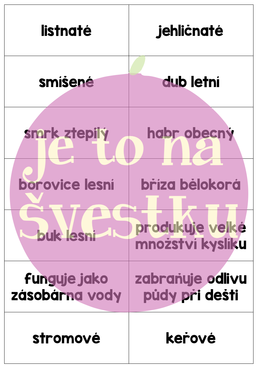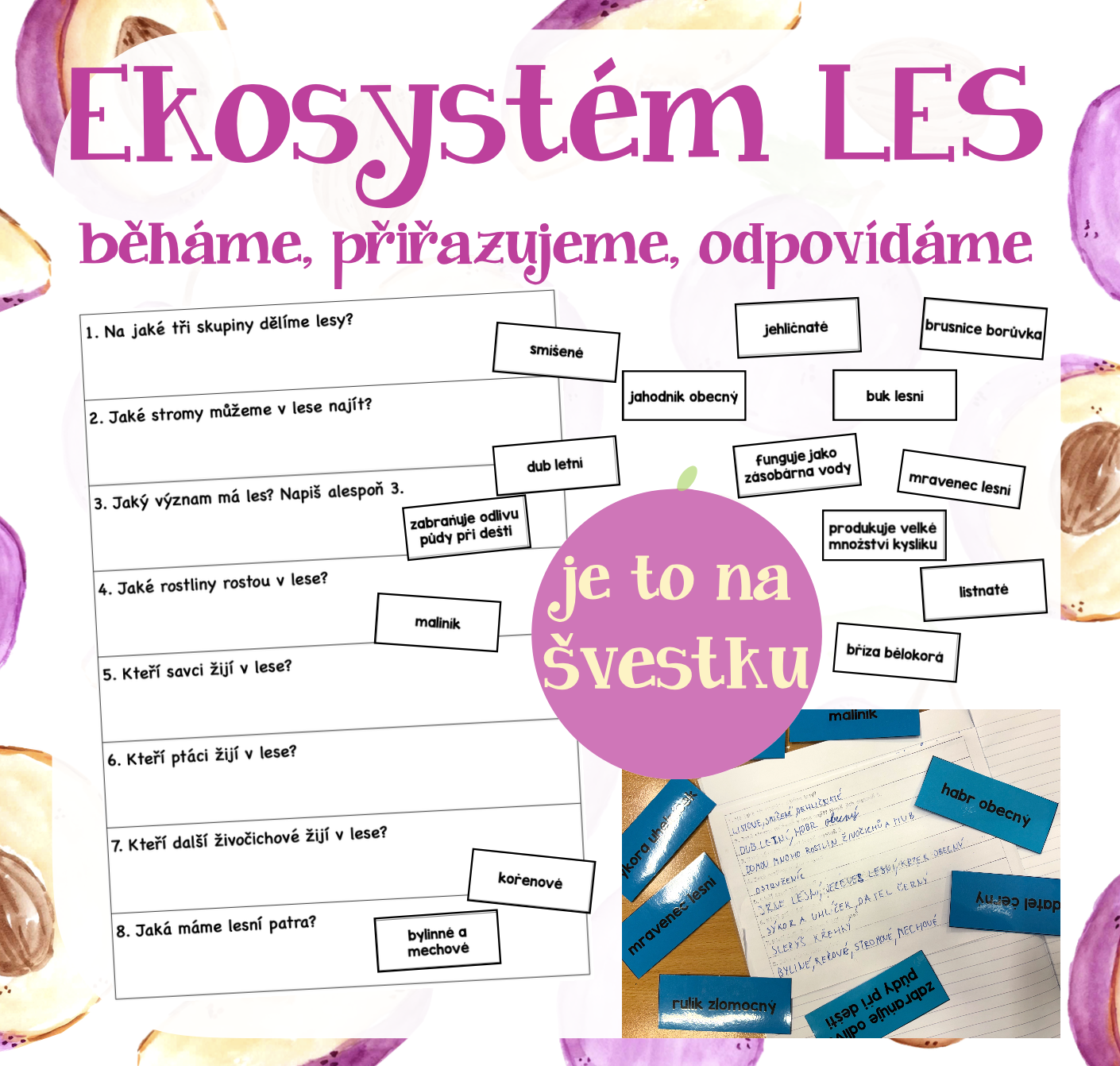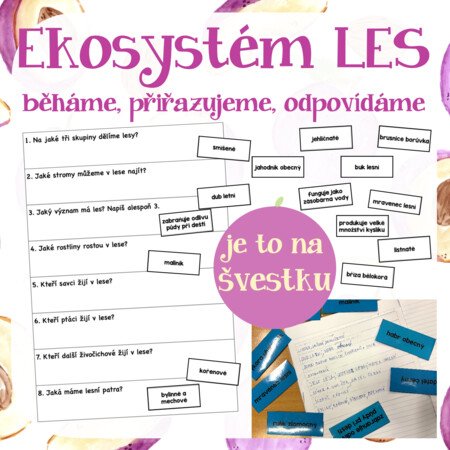 Materiál obsahuje jeden pracovní list s osmi otázkami, které jsou zaměřené na ekosystém les. Dále pak 42 kartiček s pojmy k tomuto tématu. Aktivita je koncipovaná na jednu celou vyučovací hodinu. Žáci při ní běhají a odpovídají na otázky pomocí kartiček, pracují ve skupině a společně kontrolují správnost.