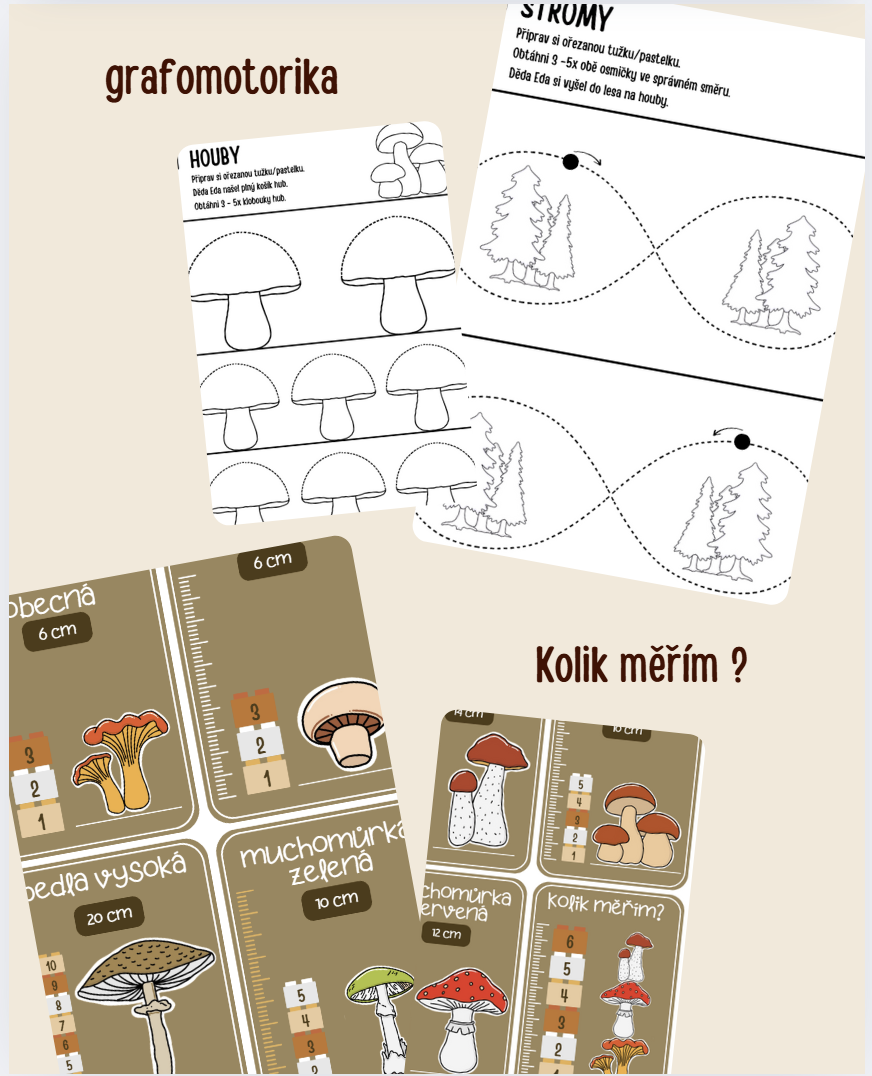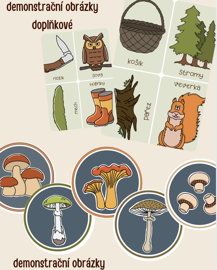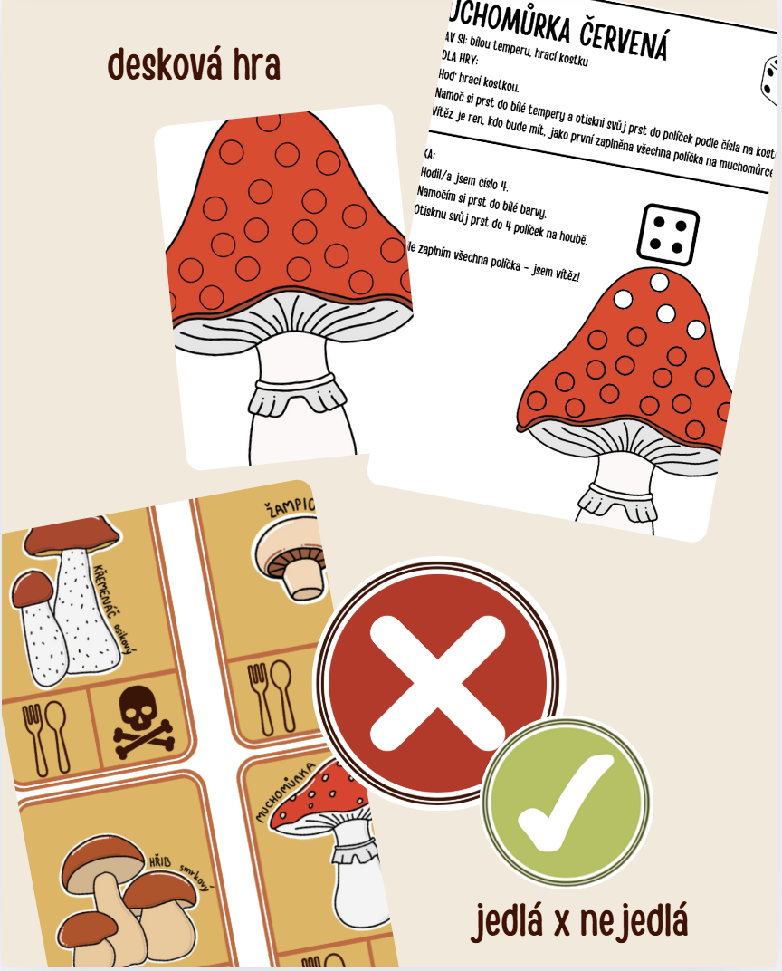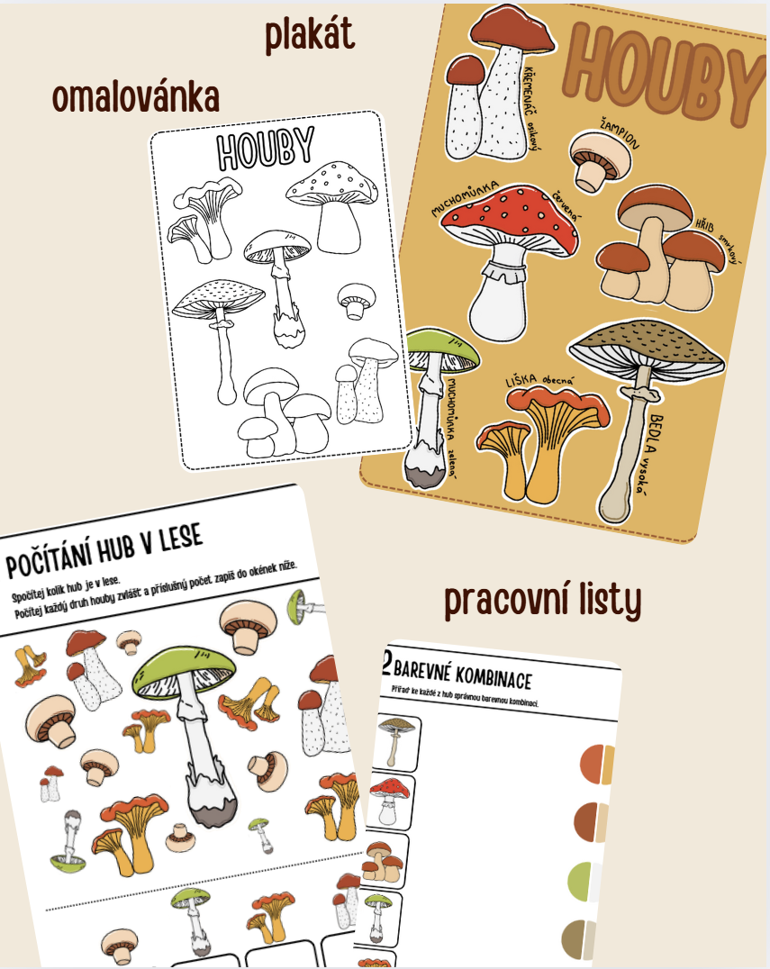 Materiál pomáhá dětem poznávat různé druhy hub – jedlé i jedovaté – pomocí obrázků, karet, pracovních listů a her. Děti si mohou hrát, porovnávat houby, určovat, co je jedlé a co ne, a procvičovat grafomotoriku. Součástí materiálu jsou také kolíčkovací karty, desková hra a zábavné úkoly, které učí děti pozorovat přírodu.