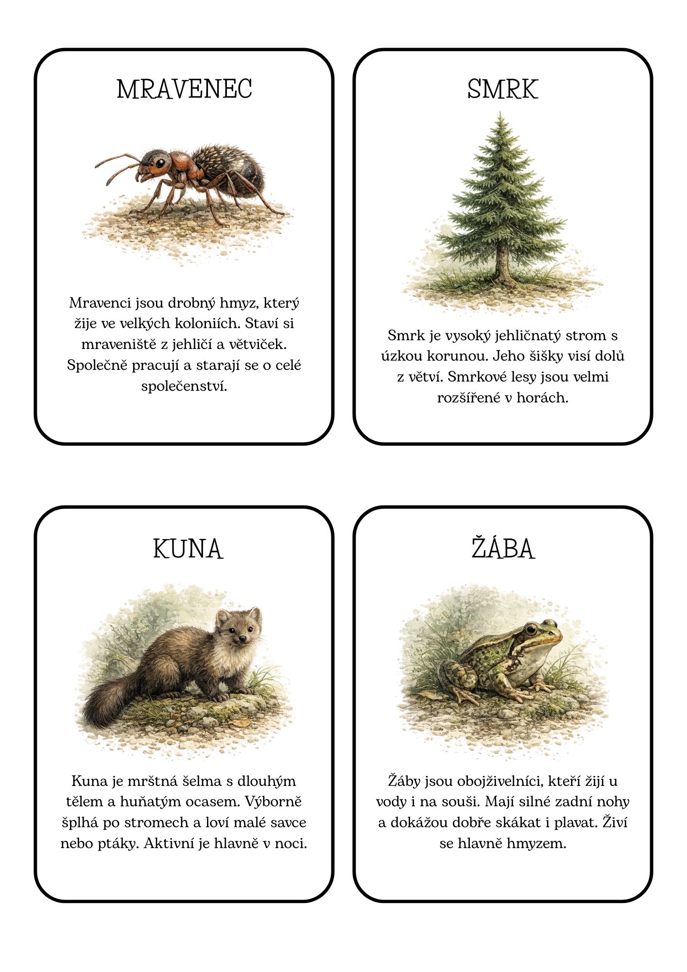 Během hry si žáci připomenou vybraná lesní zvířata a rostliny, zároveň trénují pozornost, naslouchání i čtení. Aktivita je velmi jednoduchá na organizaci a zapojí celou třídu.