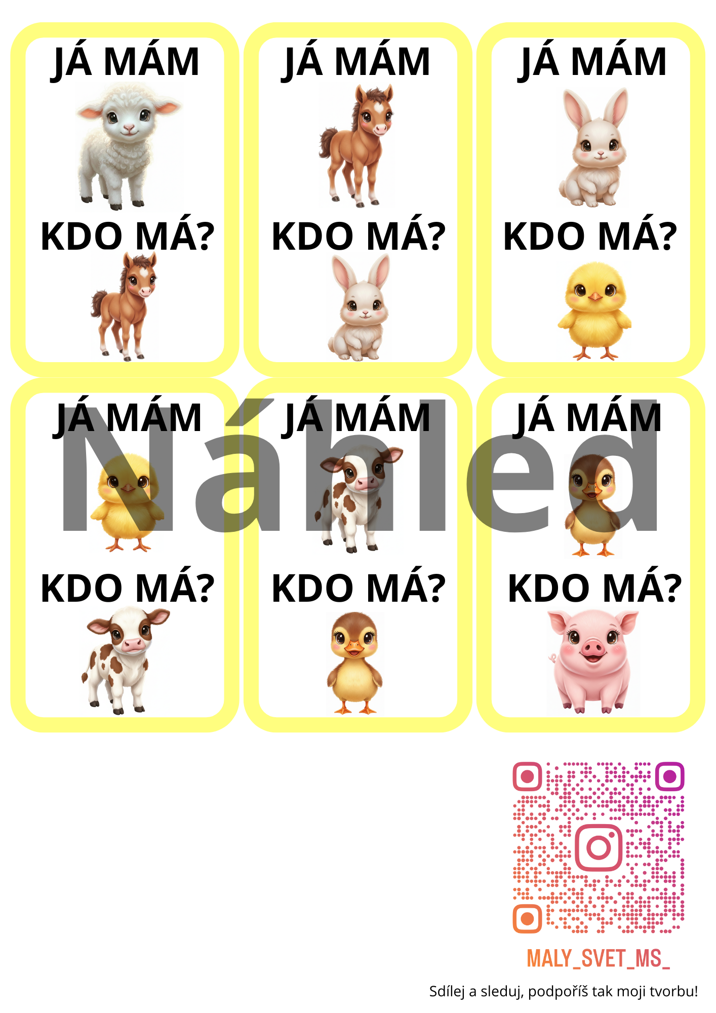 Tato kooperativní hra je zaměřena na rozvoj pozornosti, sluchového vnímání, zrakového vnímání a upevňování slovní zásoby v rámci témat jako „Zvířátka a jejich mláďátka“.