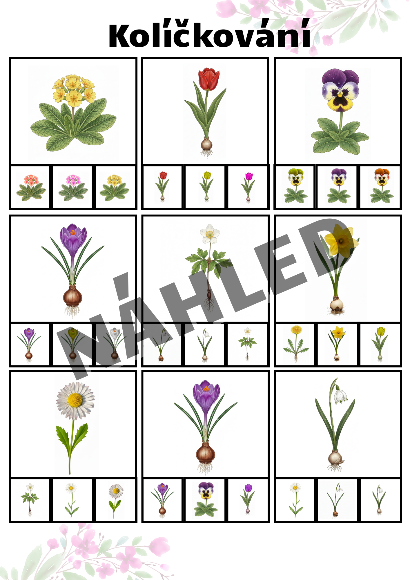 Soubor obsahuje:10x demonstračních kartiček jarních květin, 1x pexeso, 2x vystřihovánky, 19x kartiček na porovnání velikostí, 2x pracovní list na rozvoj grafomotoriky, 1x hra na rozvoj předmatematických představ (kolik kamarádů je na sedmikrásce?), 24x kartiček na předmatematické představy, 1x pracovní list na prostorovou orientaci, 20x kartiček na rozvoj zrakového vnímání, 1x pracovní list na zrakové vnímání (přiřazování stínů), 18x kartiček kolíčkování.