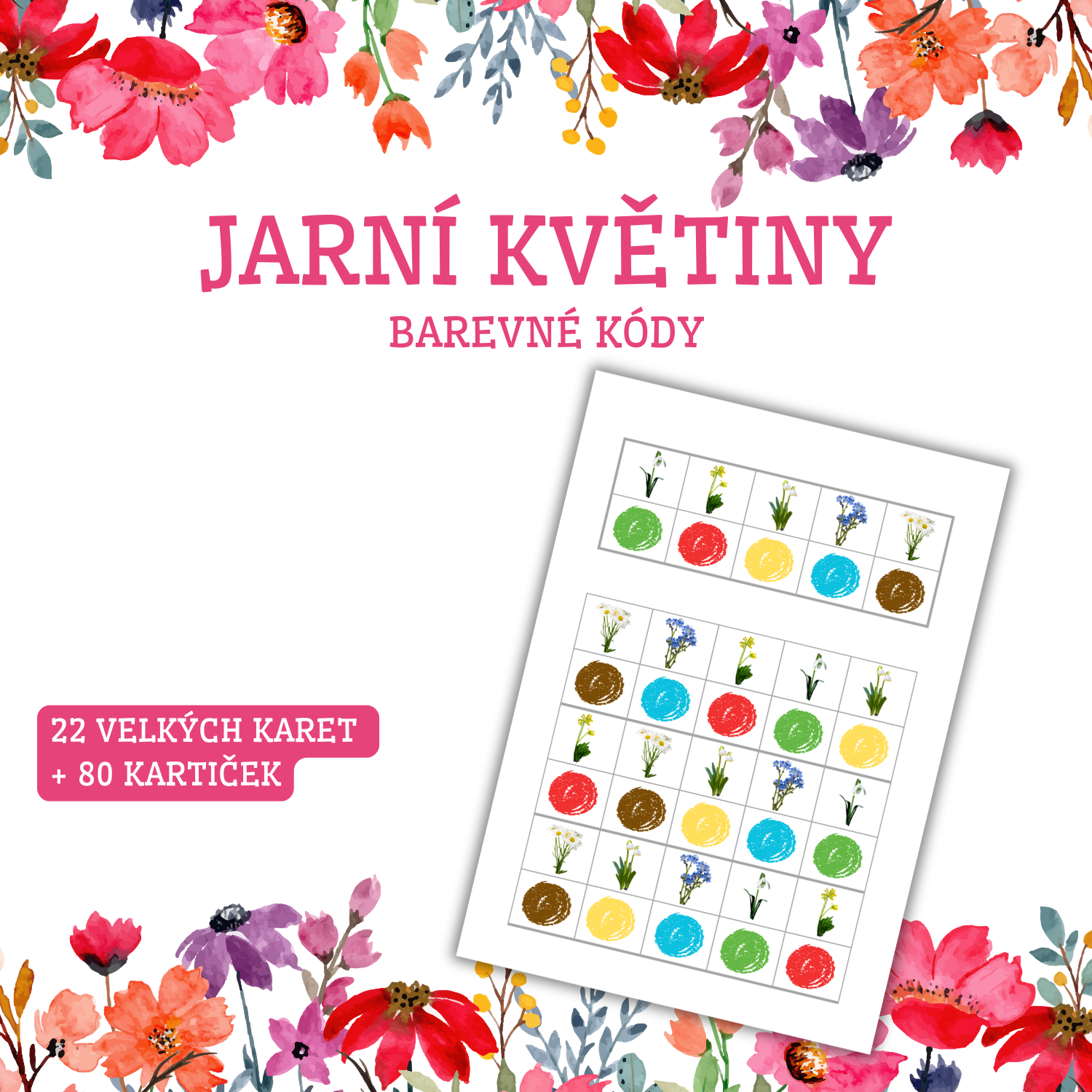 - Ve formátu velkých (zalaminovaných) karet: Po vytisknutí jednotlivé listy (str. 4-25) pro delší výdrž zalaminujte (celkem 22 velkých karet). Strany 26-27 také pro delší výdrž zalaminujte a poté z nich vystřihněte malé kartičky s obrázky barevných puntíků (celkem 80 kartiček). Na každé velké kartě jsou dvě tabulky. První tabulka je v horní části. V prvním řádku této tabulky je 5 políček s obrázky. V druhém řádku této tabulky je 5 políček s různě barevnými puntíky. Políčku s obrázkem v prvním řádku je přiřazeno políčko s barevným puntíkem pod ním. V druhé tabulce, která se nachází níže, je celkem 6 řádků. V každém lichém řádku (první, třetí, pátý) je 5 políček s obrázky. V každém sudém řádku (druhý, čtvrtý, šestý) je 5 prázdných políček. Úkolem dětí je do prázdných políček umístit kartičku s puntíkem správné barvy (kartičky ze str. 24-25). Podle vzoru v první tabulce v horní části karty může provést kontrolu pedagog či dítě samotné. Velké zalaminované karty lze využít též bez malých kartiček. Děti mohou do prázdných políček zakreslovat barevné puntíky smazatelnými fixy, přikládat do prázdných políček barevné knoflíky, kostky atd.