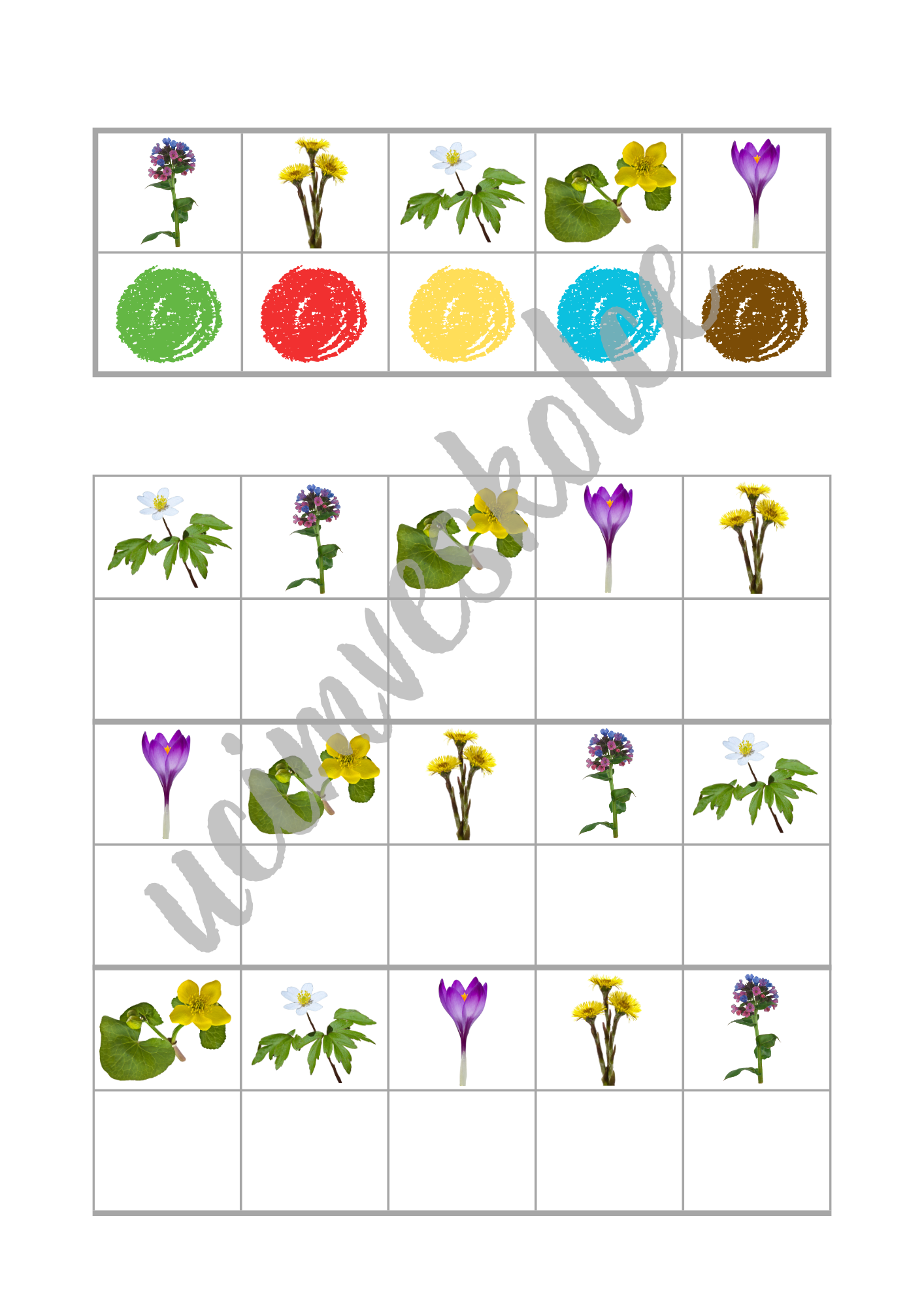 - Ve formátu pracovních listů / brožury / pracovního sešitu: Po vytisknutí stran 4-25 můžete listy svázat například kroužkovou vazbou. Využít je můžete také jednotlivě jako pracovní listy. Na každé straně / pracovním listu jsou dvě tabulky. První tabulka je v horní části. V prvním řádku této tabulky je 5 políček s obrázky. V druhém řádku této tabulky je 5 políček s různě barevnými puntíky. Políčku s obrázkem v prvním řádku je přiřazeno políčko s barevným puntíkem pod ním. V druhé tabulce, která se nachází níže, je celkem 6 řádků. V každém lichém řádku (první, třetí, pátý) je 5 políček s obrázky. V každém sudém řádku (druhý, čtvrtý, šestý) je 5 prázdných políček. Úkolem dětí je do prázdných políček dokreslit puntík správné barvy. Podle vzoru v první tabulce v horní části karty může provést kontrolu pedagog či dítě samotné.