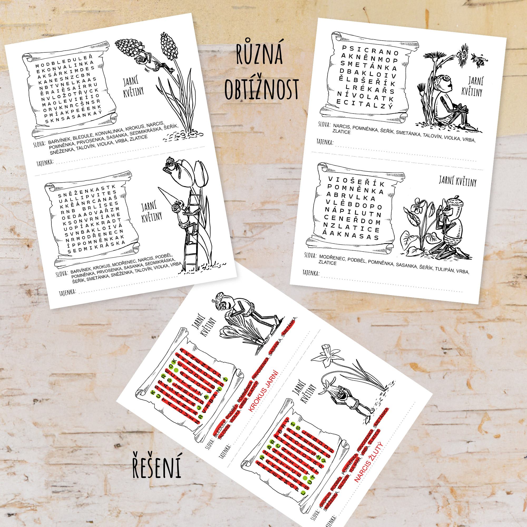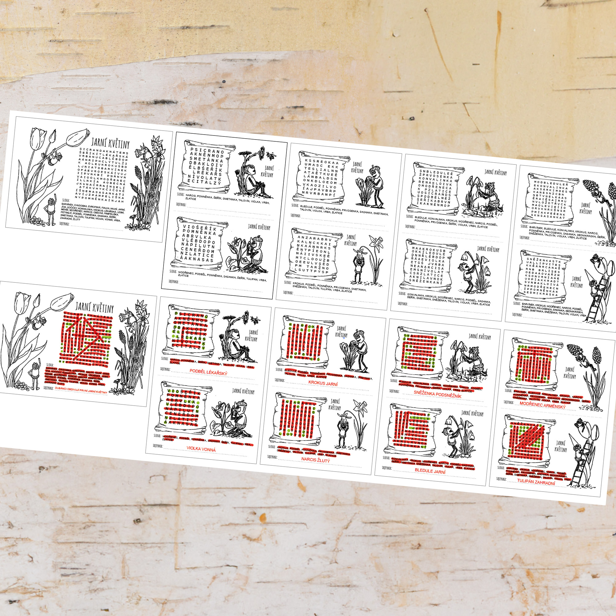 - u každé osmisměrky je seznam slov k vyškrtání, přičemž zbylá písmenka odhalí tajenku - název květiny, která je také na ilustraci s dubánkem