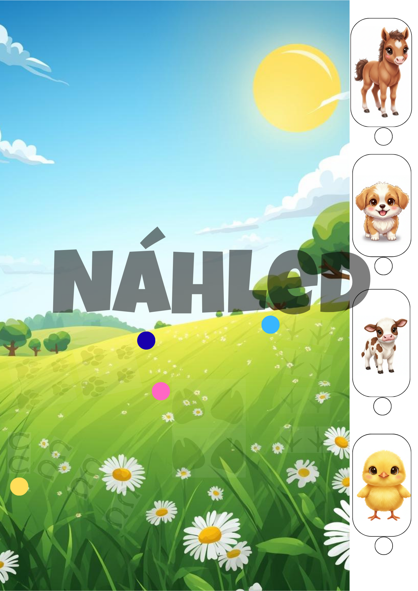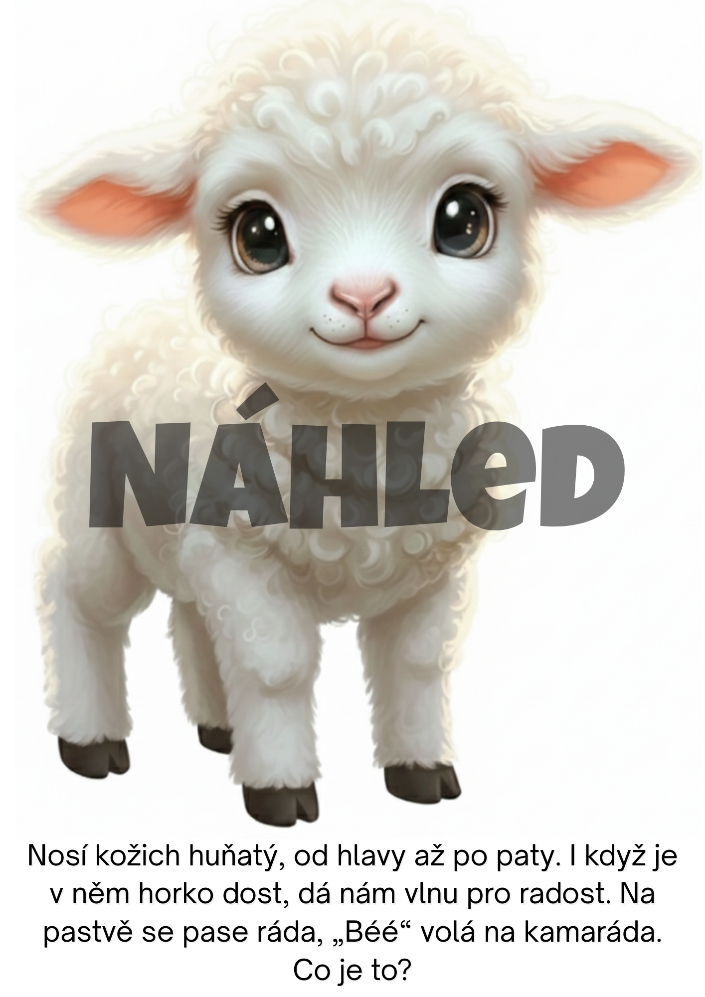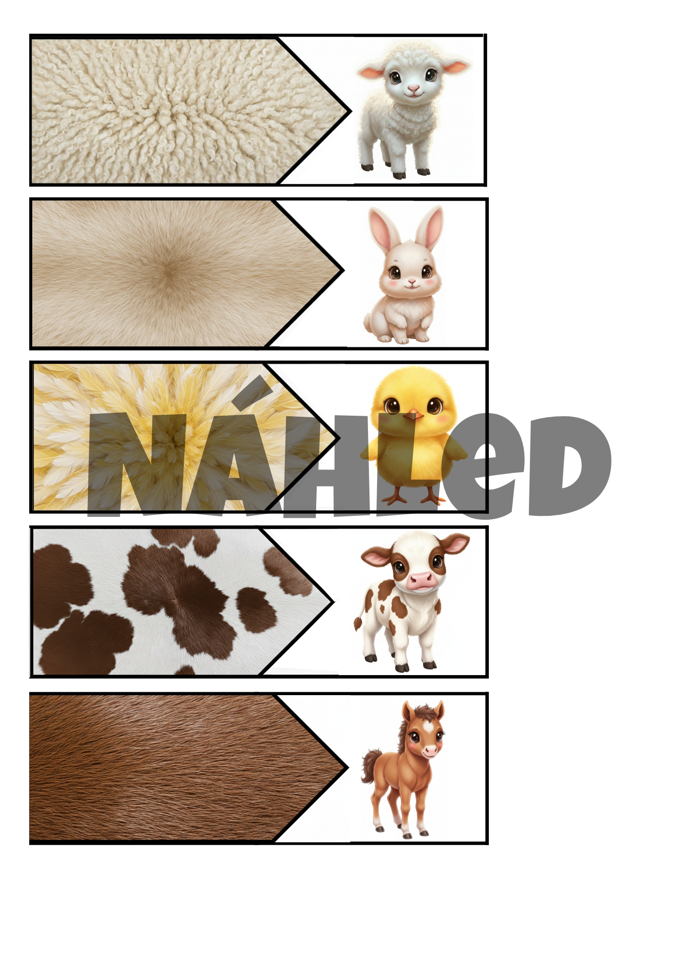 - 10 demonstračních kartiček s hádankou pro děti (štěně, kachňátko, kůzlátko, koťátko, králík, sele, kuře, ovce, hříbě, tele)