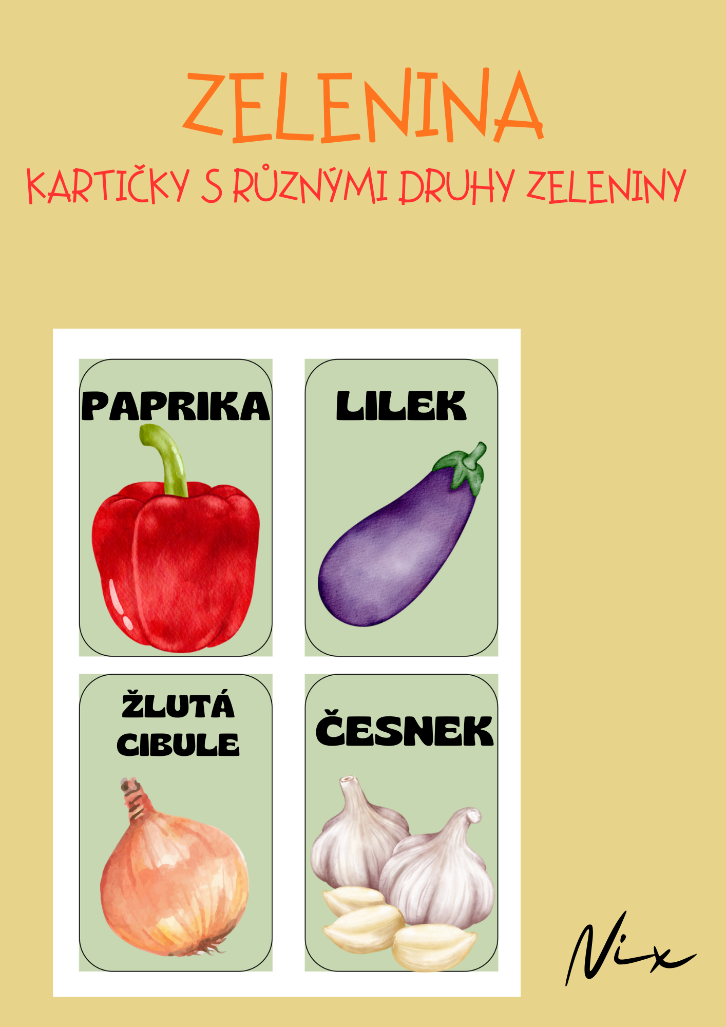 Kartičky s různými druhy zeleniny s názvem a obrázkem.