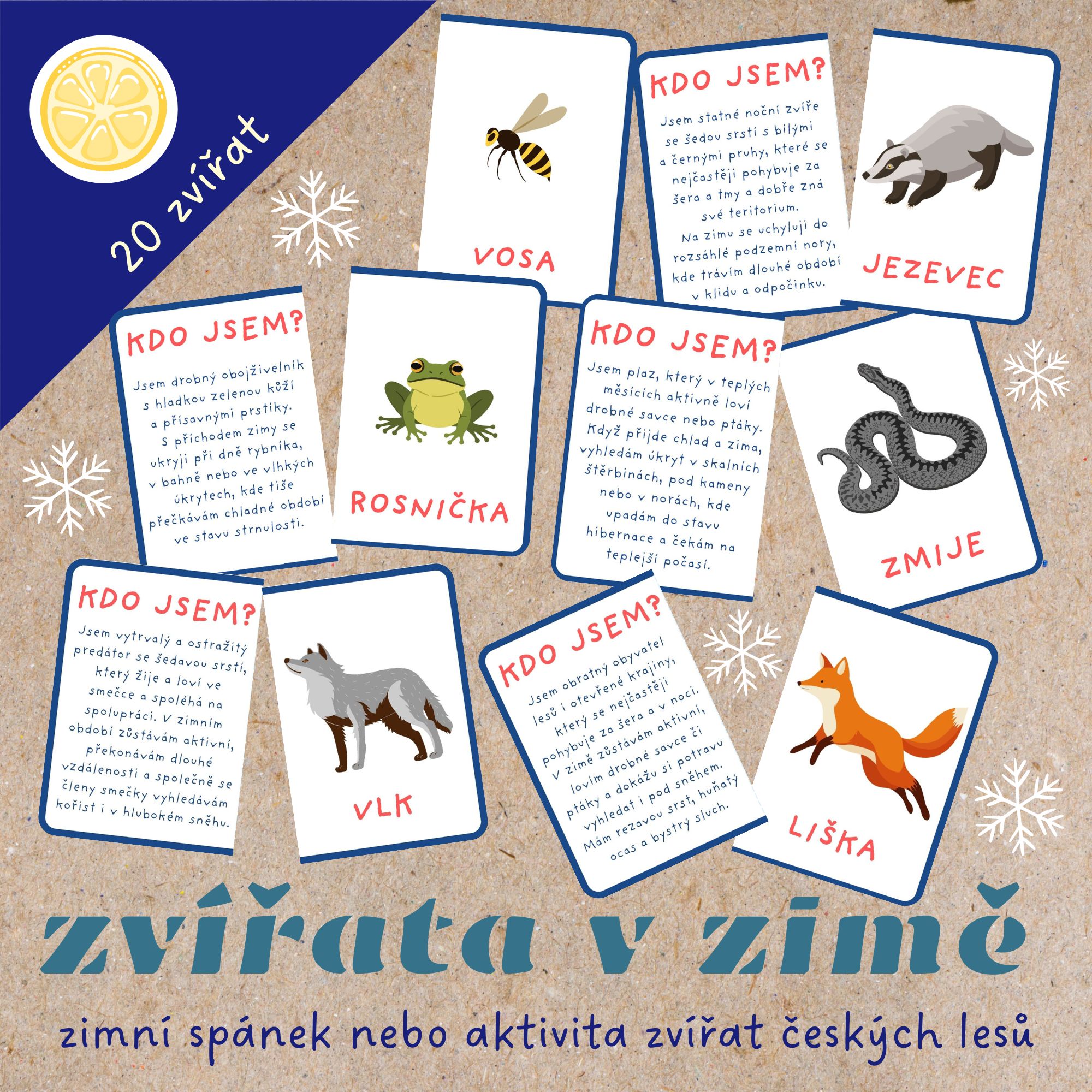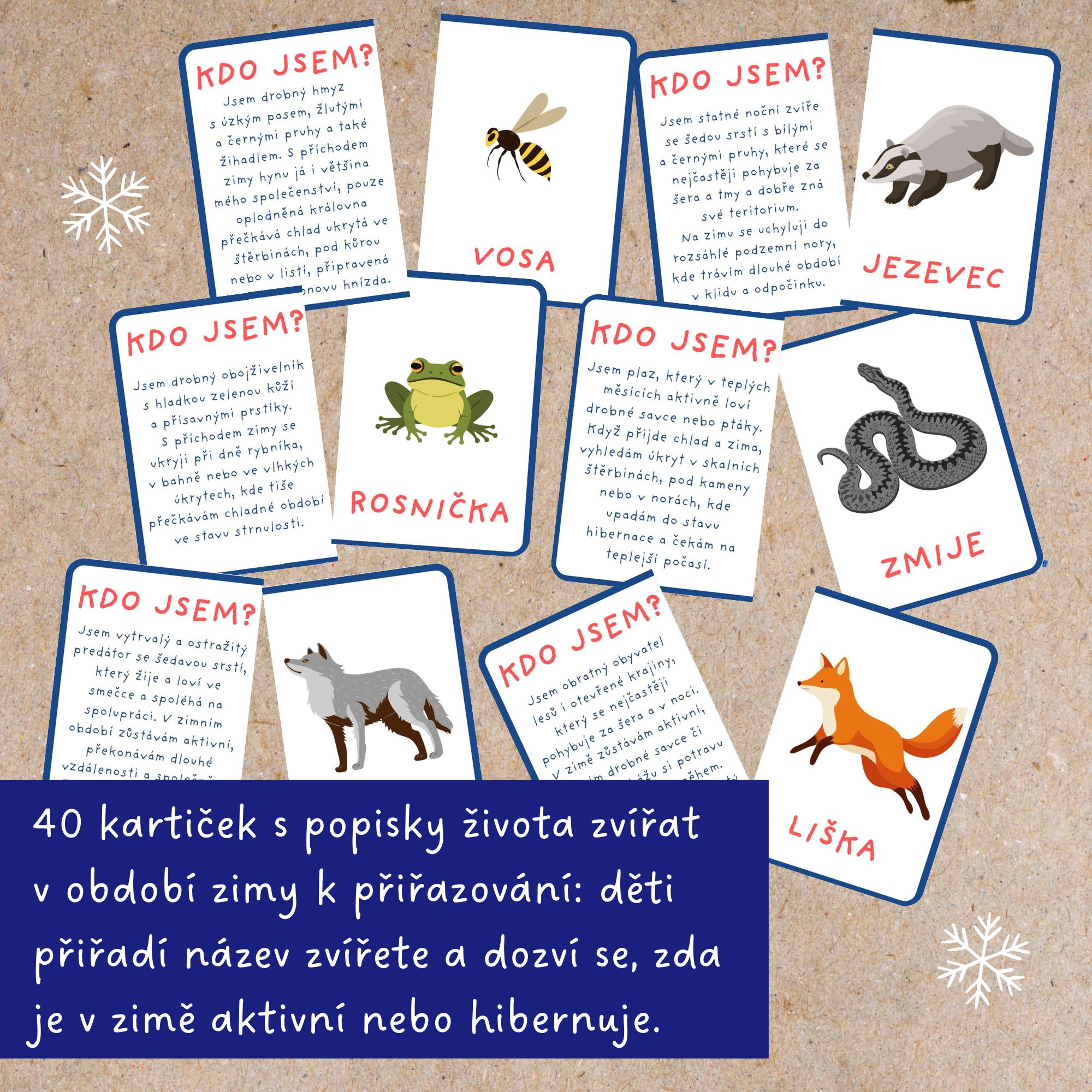 🐺Sada dvaceti kartiček s krátkými hádankami, které děti seznámí se životem zvířat našich lesů v zimním období. Děti přiřazují kartičky s informacemi ke správnému zvířátku a dozví se, která z nich přes zimu hibernují a která zůstávají aktivní.