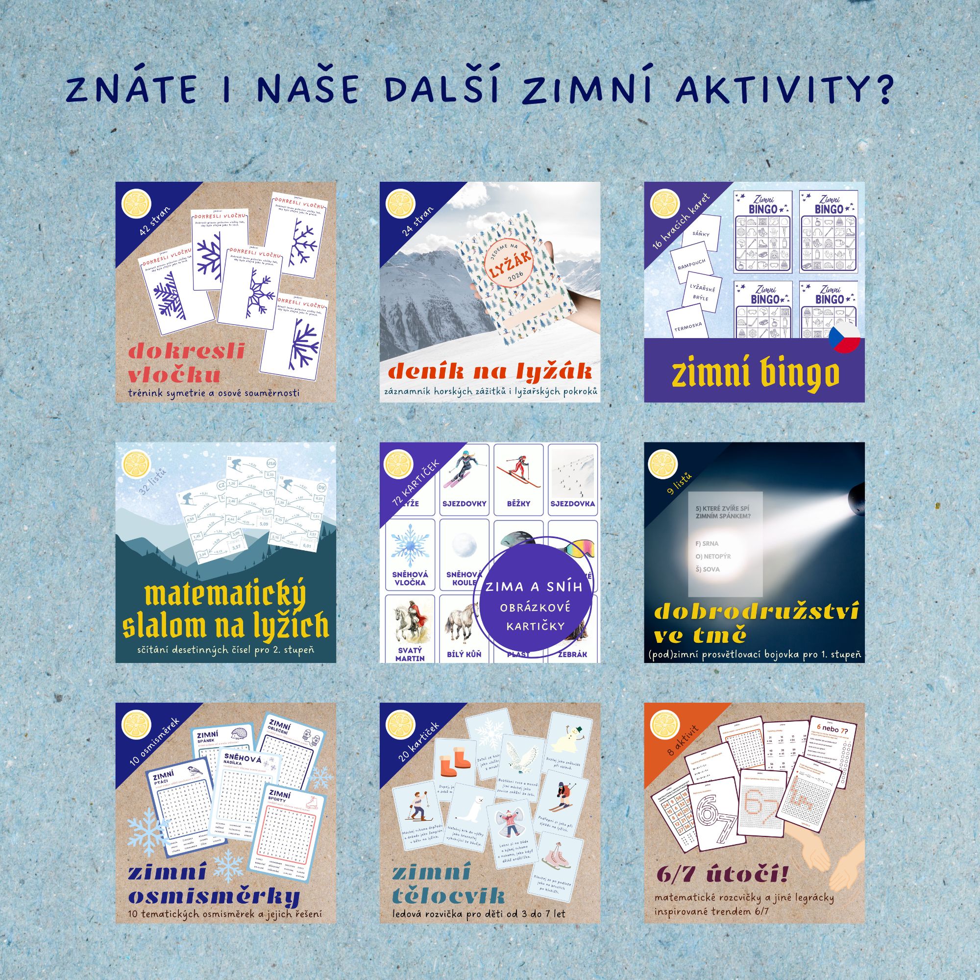 🐺Pokud hledáte další zimní aktivity, podívejte se na náš ZIMNÍ TĚLOCVIK, MATEMATICKÝ SLALOM NA LYŽÍCH, ZIMNÍ OSMISMĚRKY, DOKRESLI VLOČKU, DENÍK NA LYŽÁK, ZIMNÍ BINGO, ZIMNÍ ZÁLOŽKY nebo OBRÁZKOVÉ KARTIČKY.