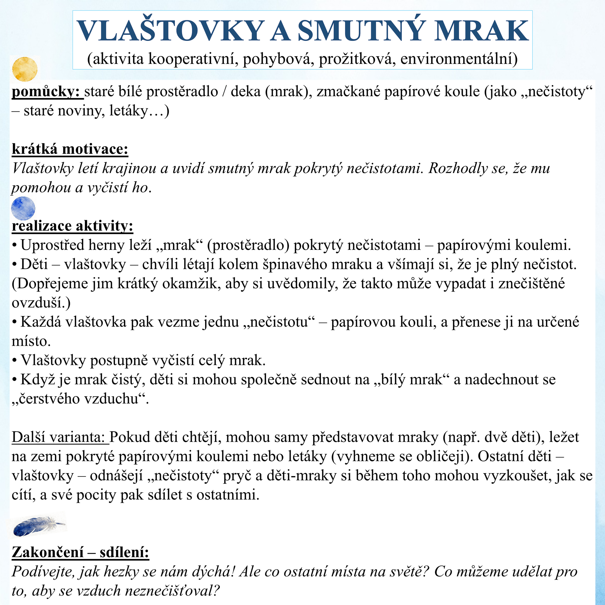 Velký důraz je kladen na práci se starým papírem a zbytkovým materiálem, který se během her proměňuje podle dětské fantazie i příběhu aktivit. Starý papír se tak stává například hmyzem, který vlaštovky loví (zmačkané kuličky ze starého papíru), blátem a stébly trávy pro stavbu hnízda (proužky starého novinového papíru) nebo nečistotami na mraku, který vlaštovky společně čistí, aby se jim lépe dýchalo. (Zmačkané koule ze starých letáků, novin...)