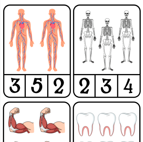 16 karet na téma lidské tělo zaměřených na počty.