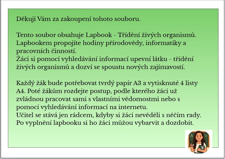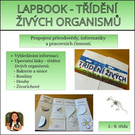 Tento soubor obsahuje Lapbook - Třídění živých organismů. Lapbookem propojíte hodiny přírodovědy, informatiky a pracovních činností.