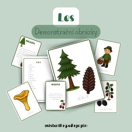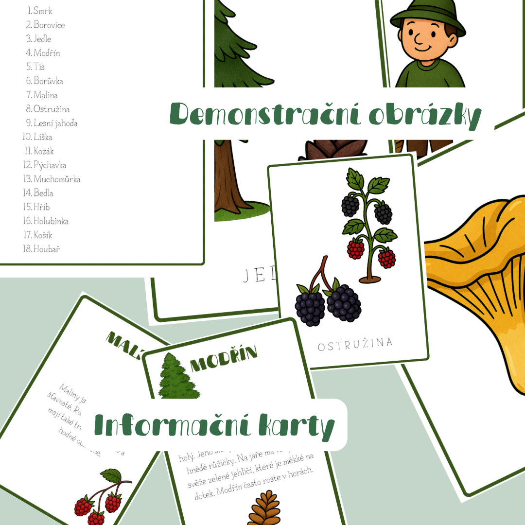 - 12 informačních kartiček (lesní plody, houby a jehličnaté stromy).