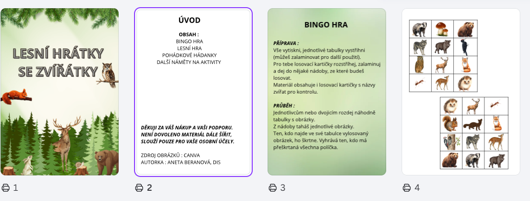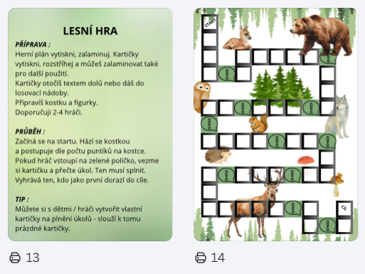 MATERIÁL OBSAHUJE 22 PDF STRAN. NAJDETE TAM HRU BINGO, LESNÍ HRU, KDE SE HÁZÍ KOSTKOU, AUTORSKÉ POHÁDKOVÉ HÁDANKY A DALŠÍ NÁMĚTY NA AKTIVITY SPOJENÉ S LESNÍ TÉMATIKOU.
