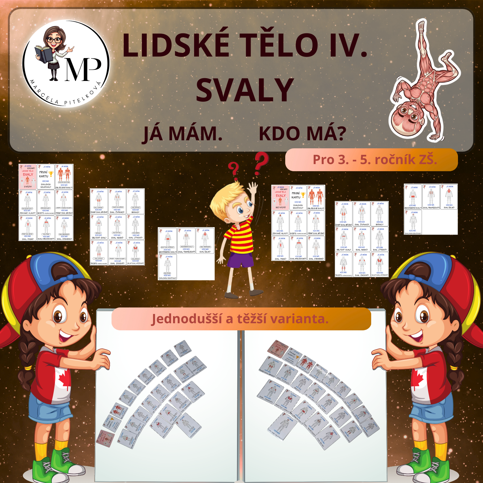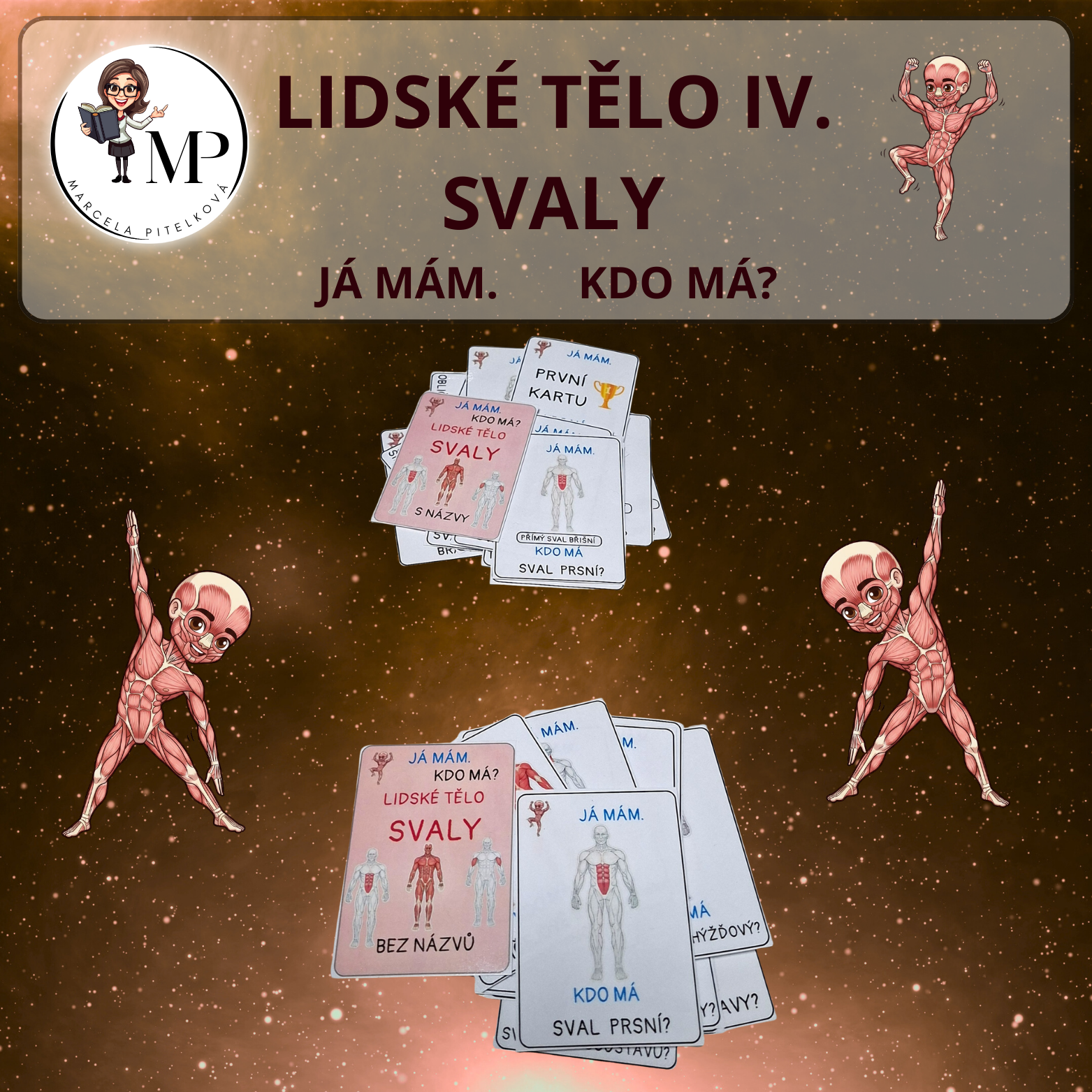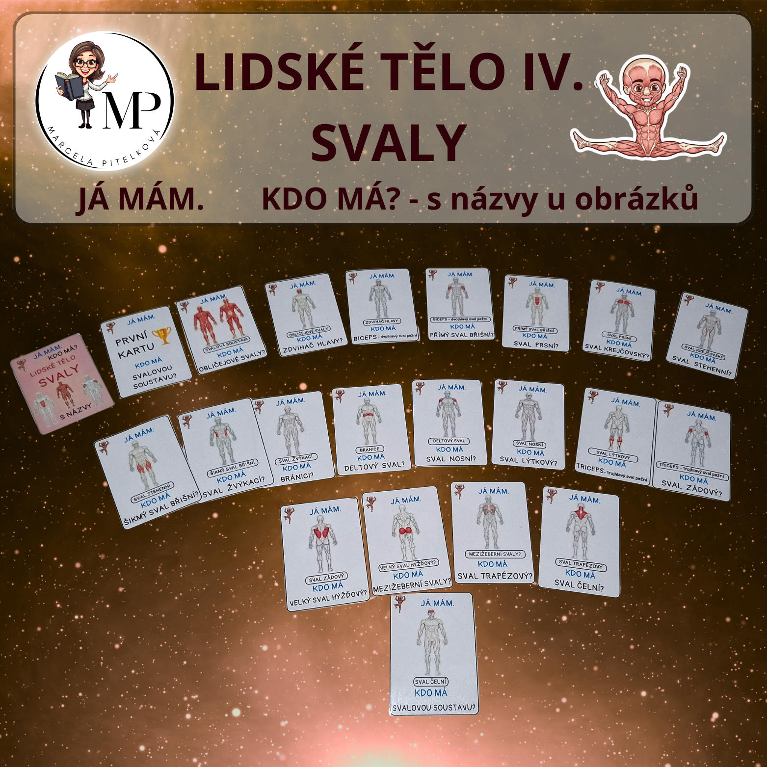 Téma svaly v těle - dvě sady. Jedna s názvy u obrázků a druhá bez názvů u obrázků. Hra koncipovaná jako aktivita JÁ MÁM, KDO MÁ. Vhodné do Přírodovědy ve 3. -5. ročníku.