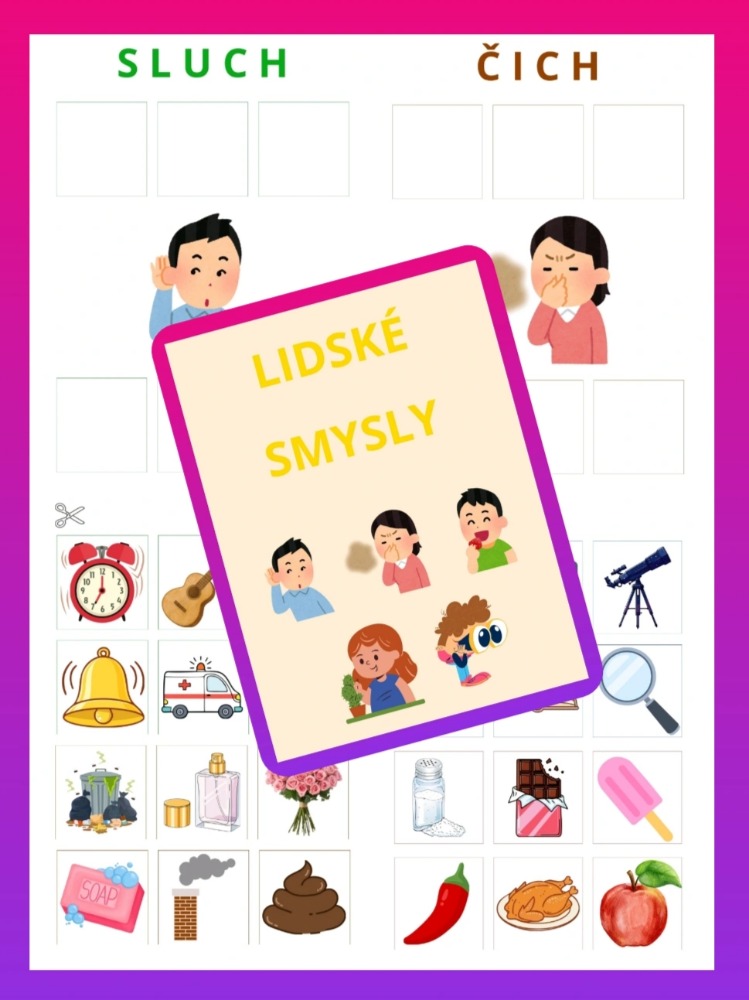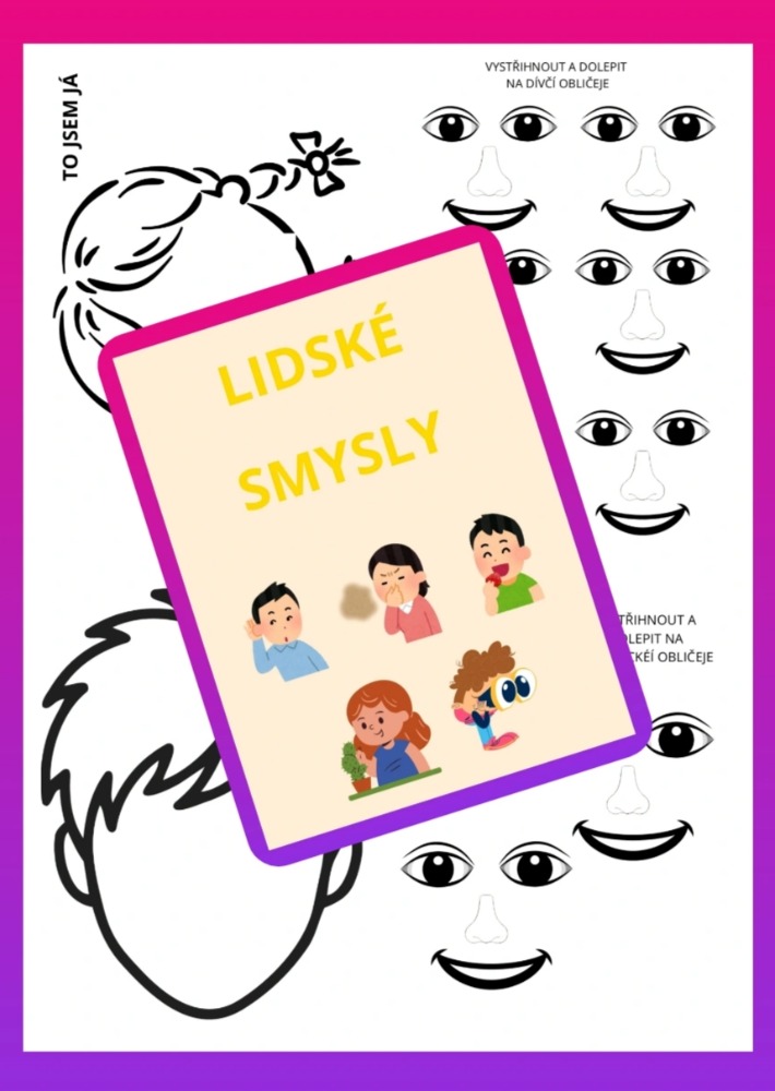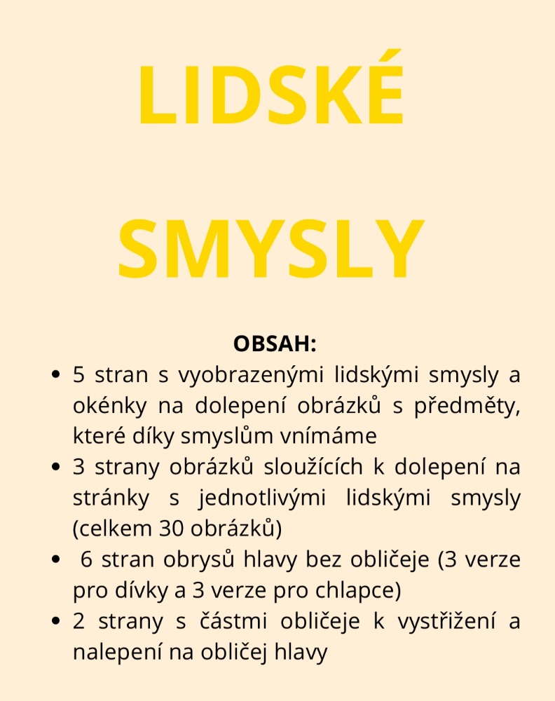 - str. 8 - 10 - obrázky sloužící k pokládání/dolepení na stránky s jednotlivými lidskými smysly (celkem 30 obrázků)