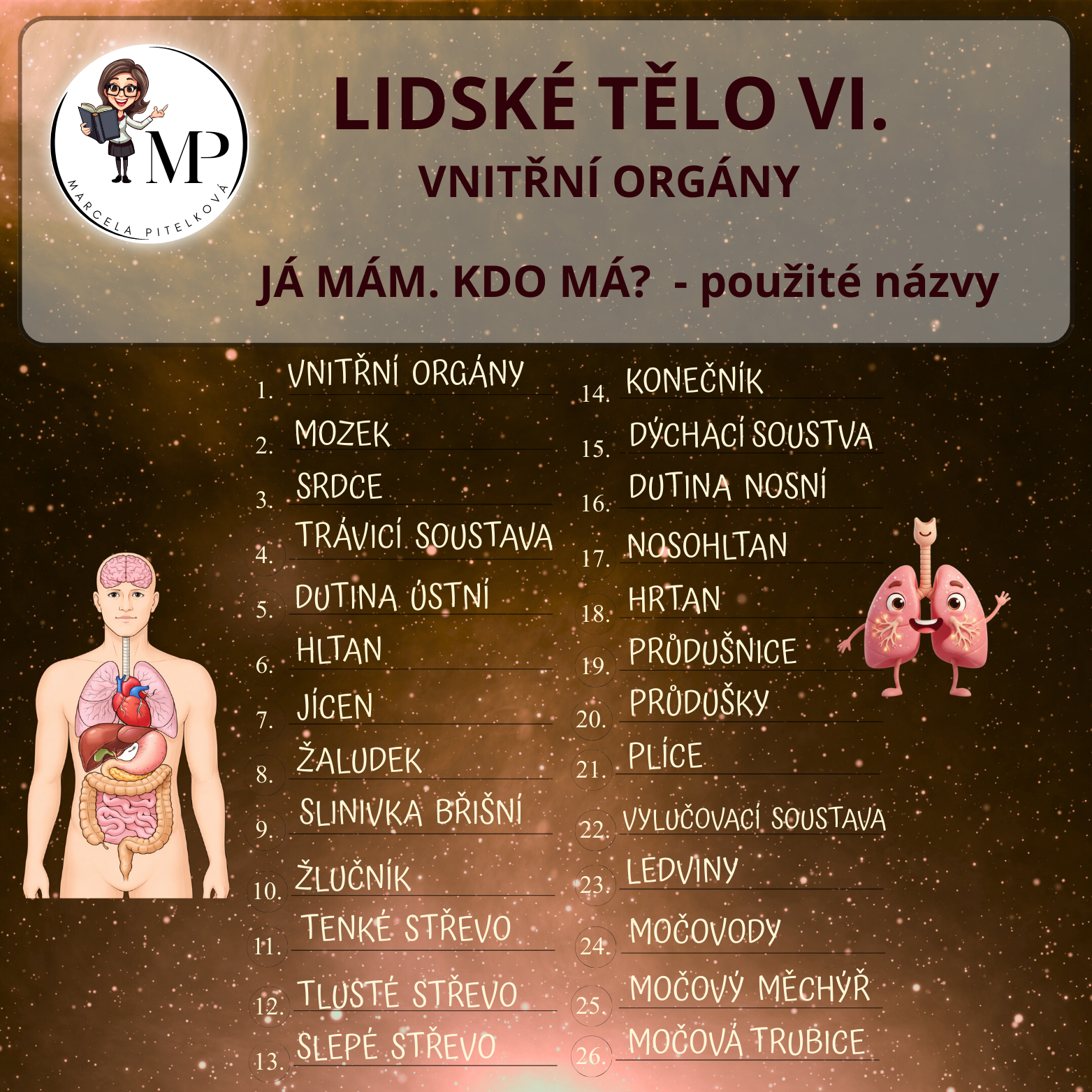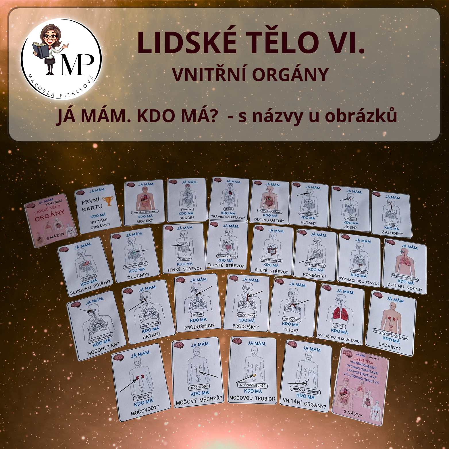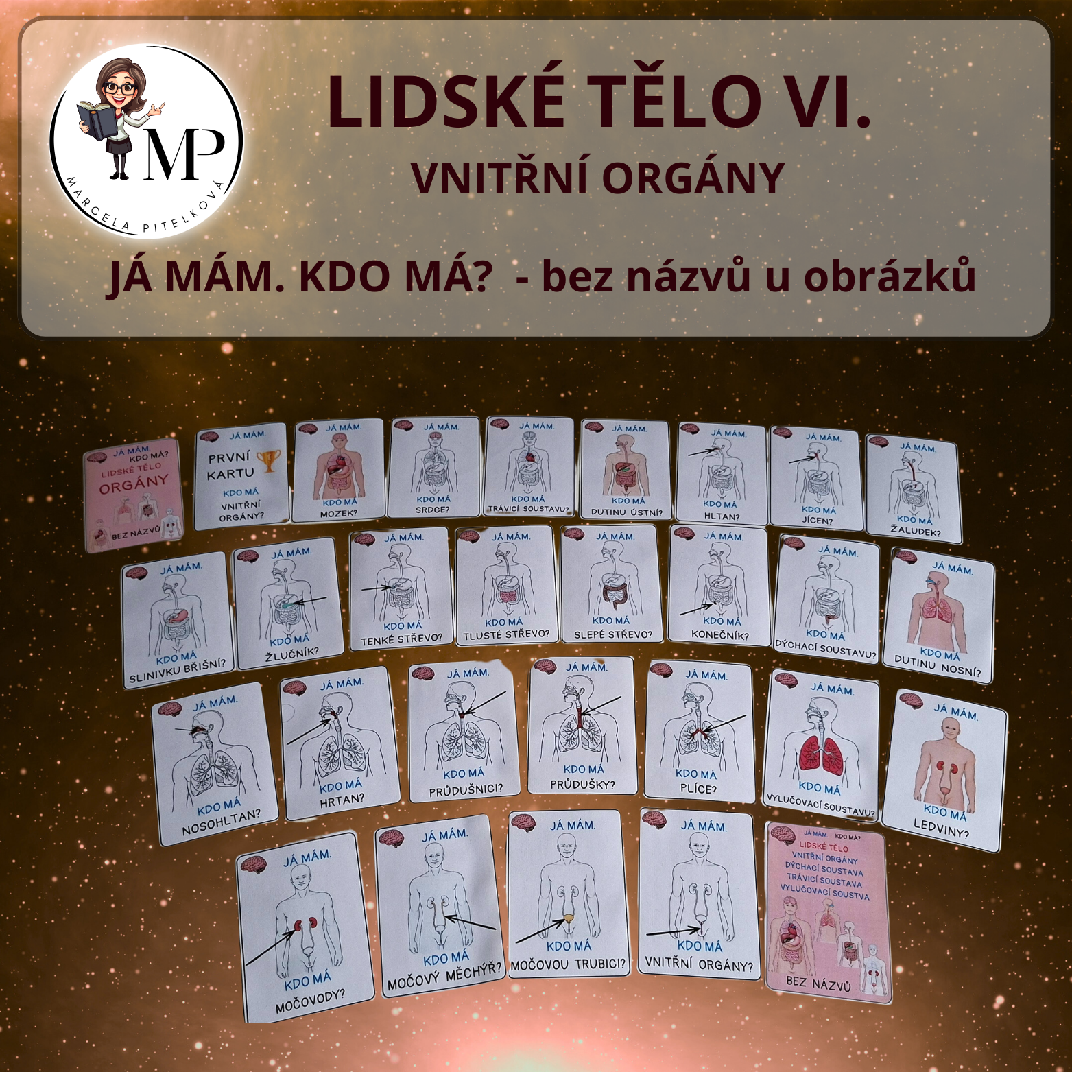 Téma orgány: srdce, mozek, Dýchací soustava, Trávicí soustava, Vylučovací soustava. Dvě sady -jedna s názvy u obrázků a druhá bez názvů u obrázků.
