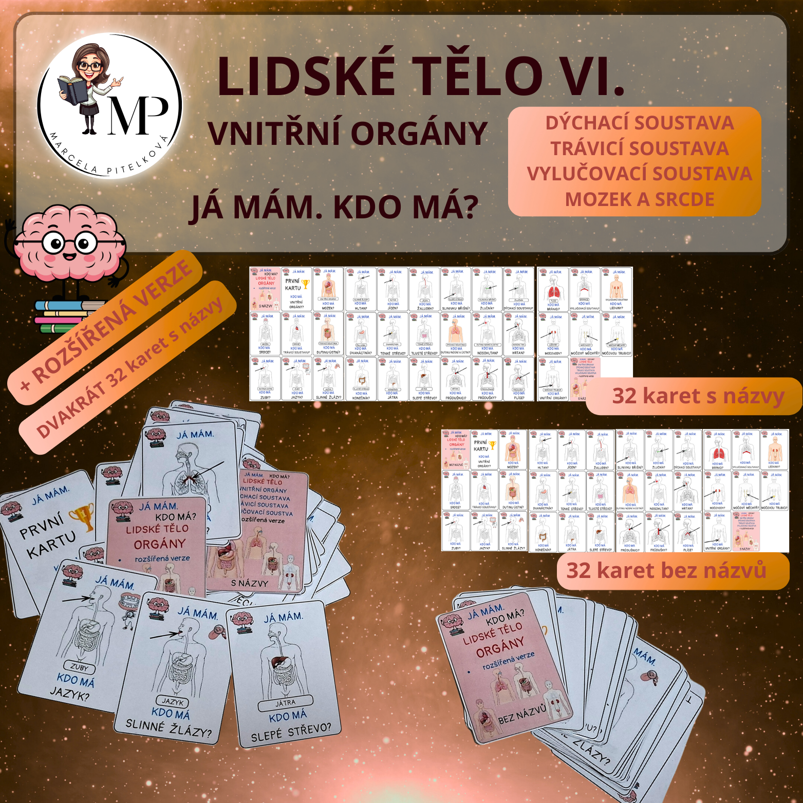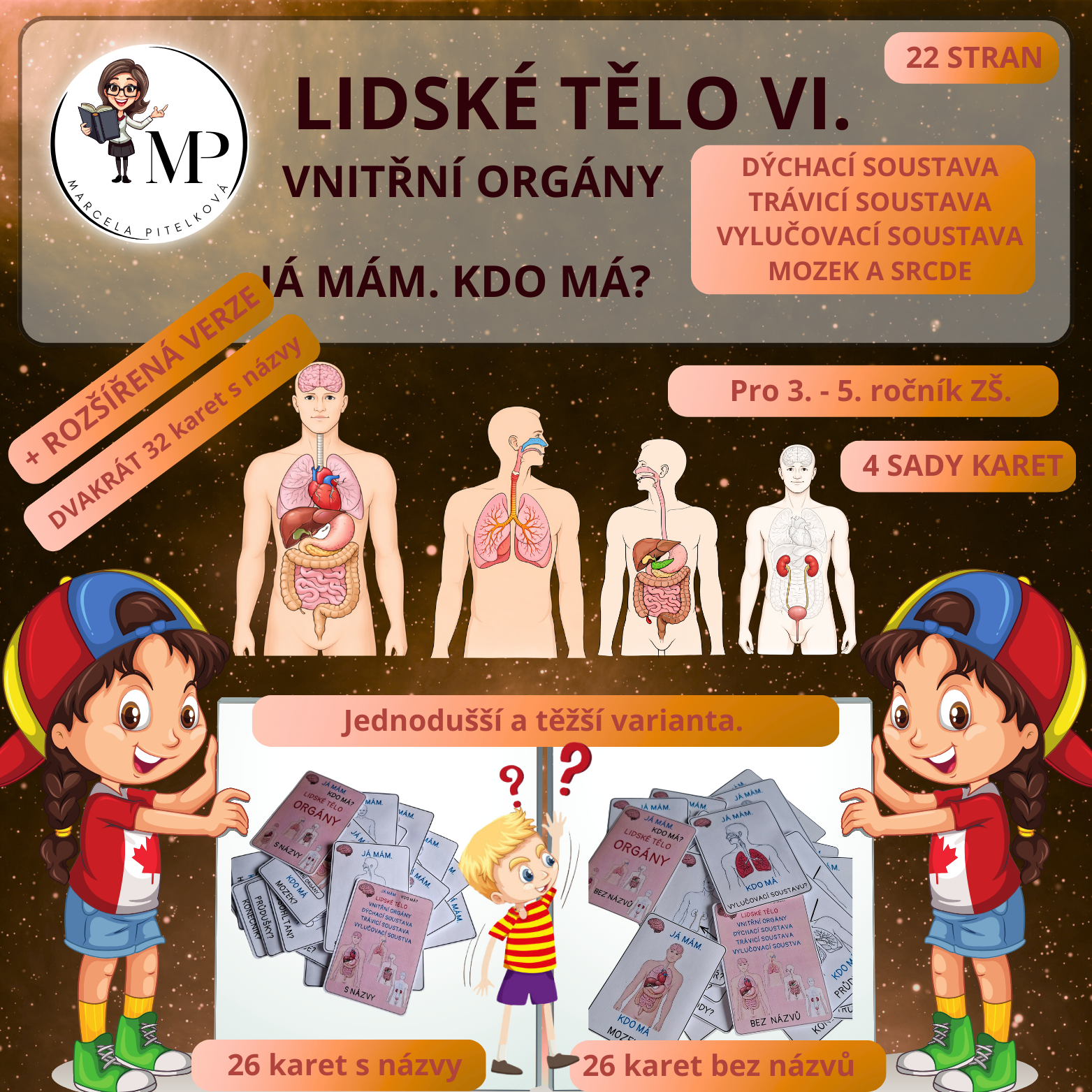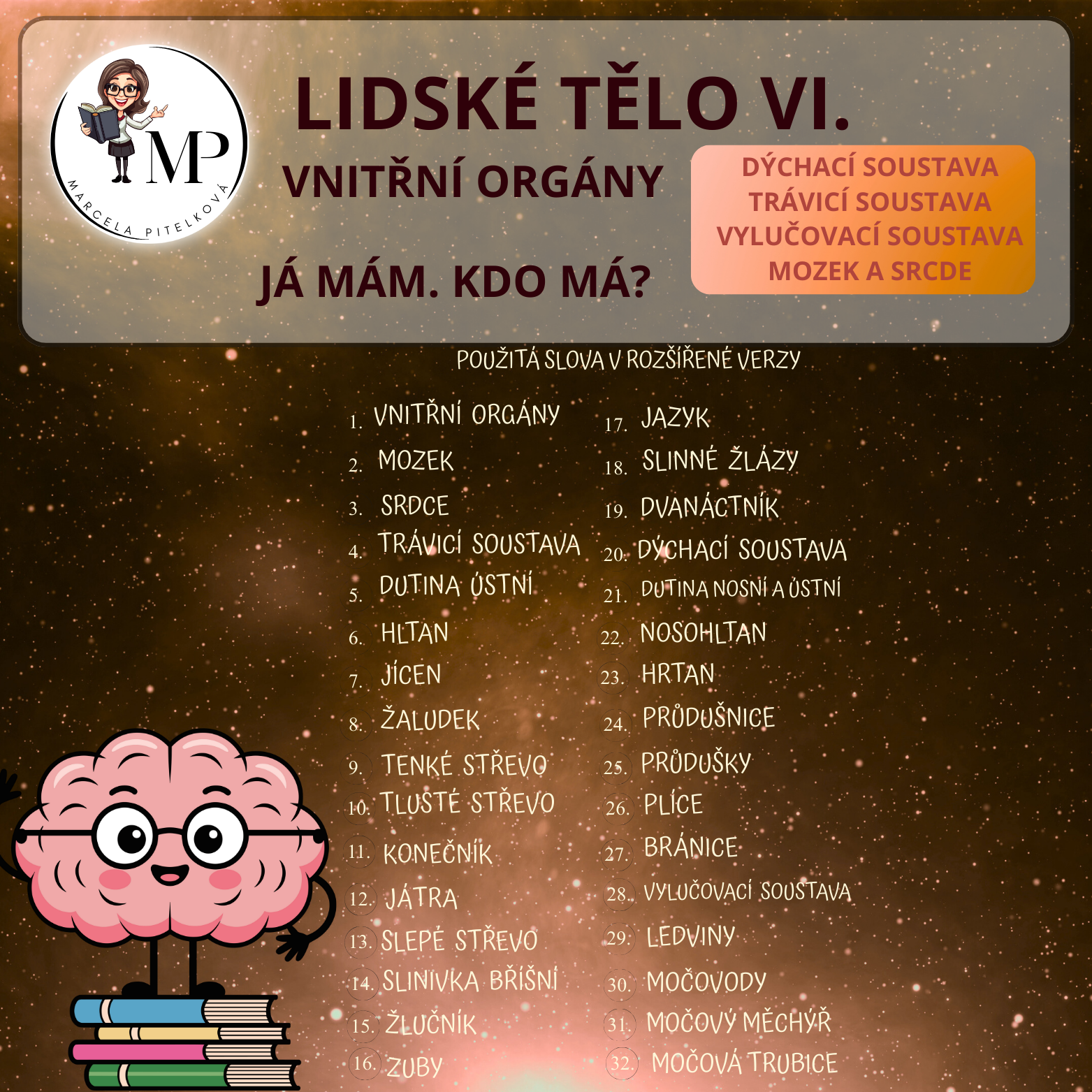 Téma orgány: srdce, mozek, Dýchací soustava, Trávicí soustava, Vylučovací soustava. Dvě sady -jedna s názvy u obrázků a druhá bez názvů u obrázků.