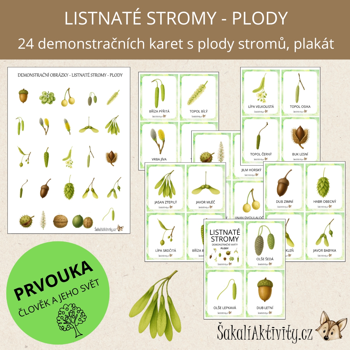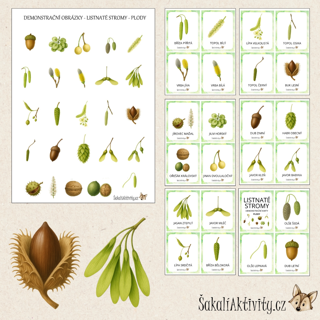 Demonstrační obrázky – plody listnatých stromů jsou vzdělávací materiál vhodný pro mateřské školy, základní školy, školní družiny i domácí vzdělávání.