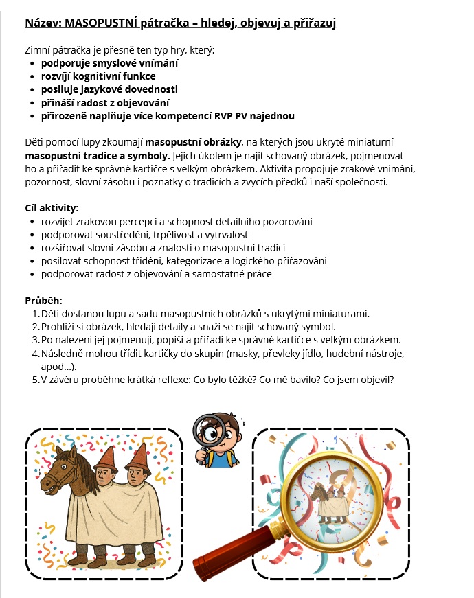 Děti pomocí lupy zkoumají masopustní obrázky, na kterých jsou ukryté miniaturní masopustní tradice a symboly. Jejich úkolem je najít schovaný obrázek, pojmenovat ho a přiřadit ke správné kartičce s velkým obrázkem. Aktivita propojuje zrakové vnímání, pozornost, slovní zásobu i poznatky o tradicích a zvycích předků i naší společnosti.