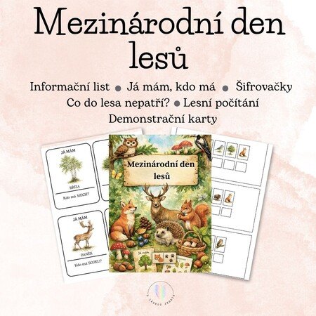 Tento výukový materiál byl vytvořen k příležitosti Mezinárodního dne lesů, který se každoročně slaví 21. března. Pomůže dětem hravou formou poznat lesní zvířata, rostliny a houby a zároveň si procvičit čtení, logické myšlení i matematické dovednosti.