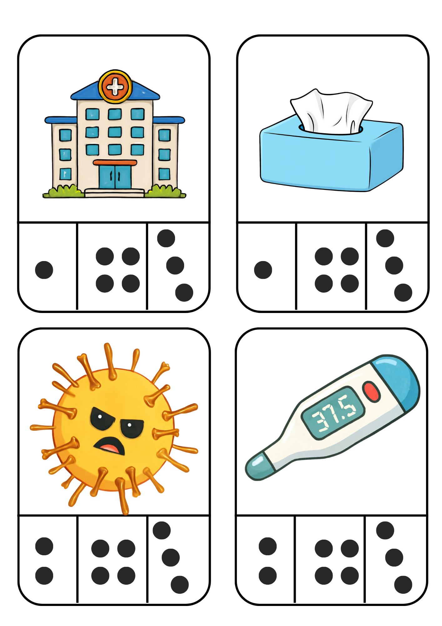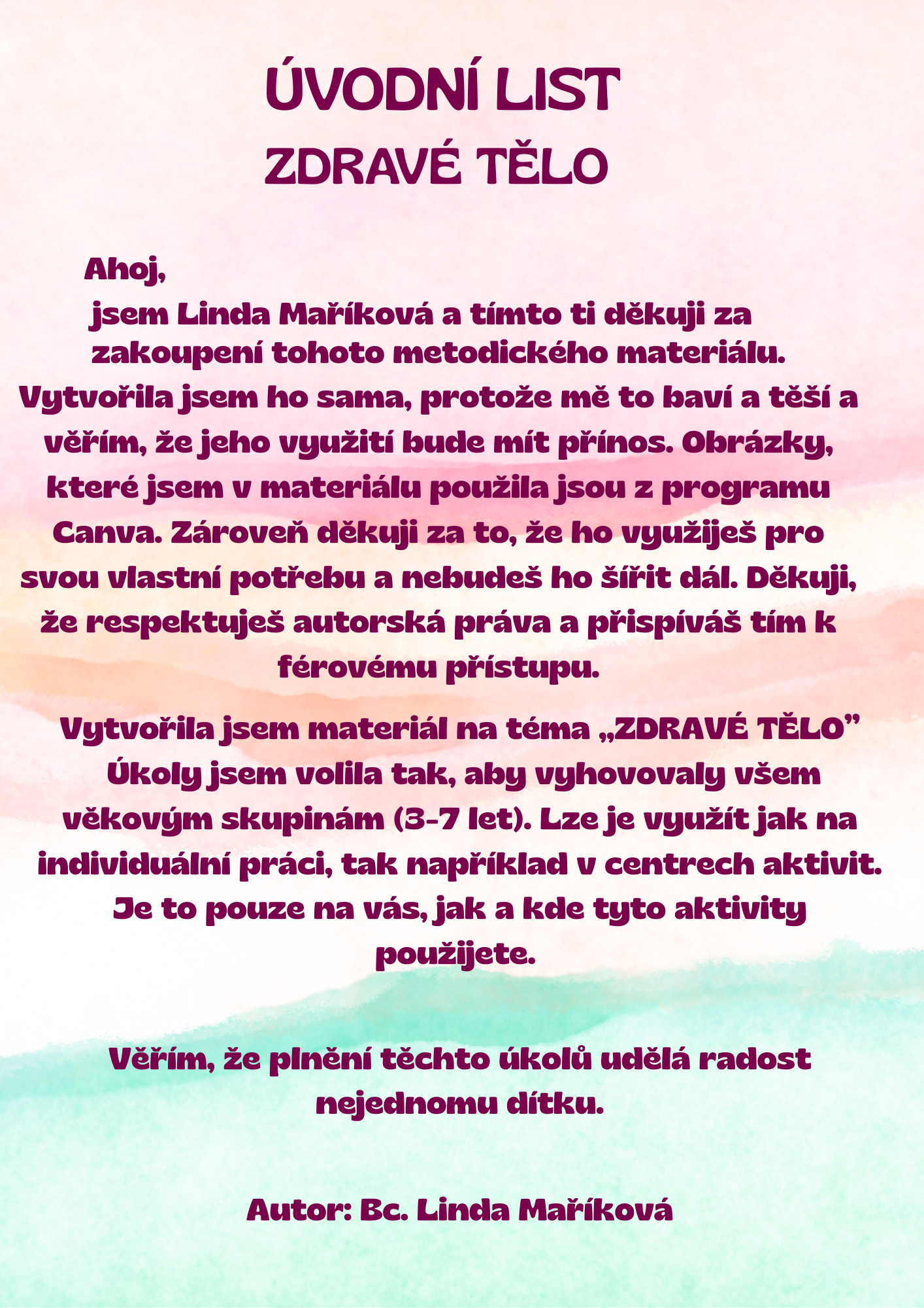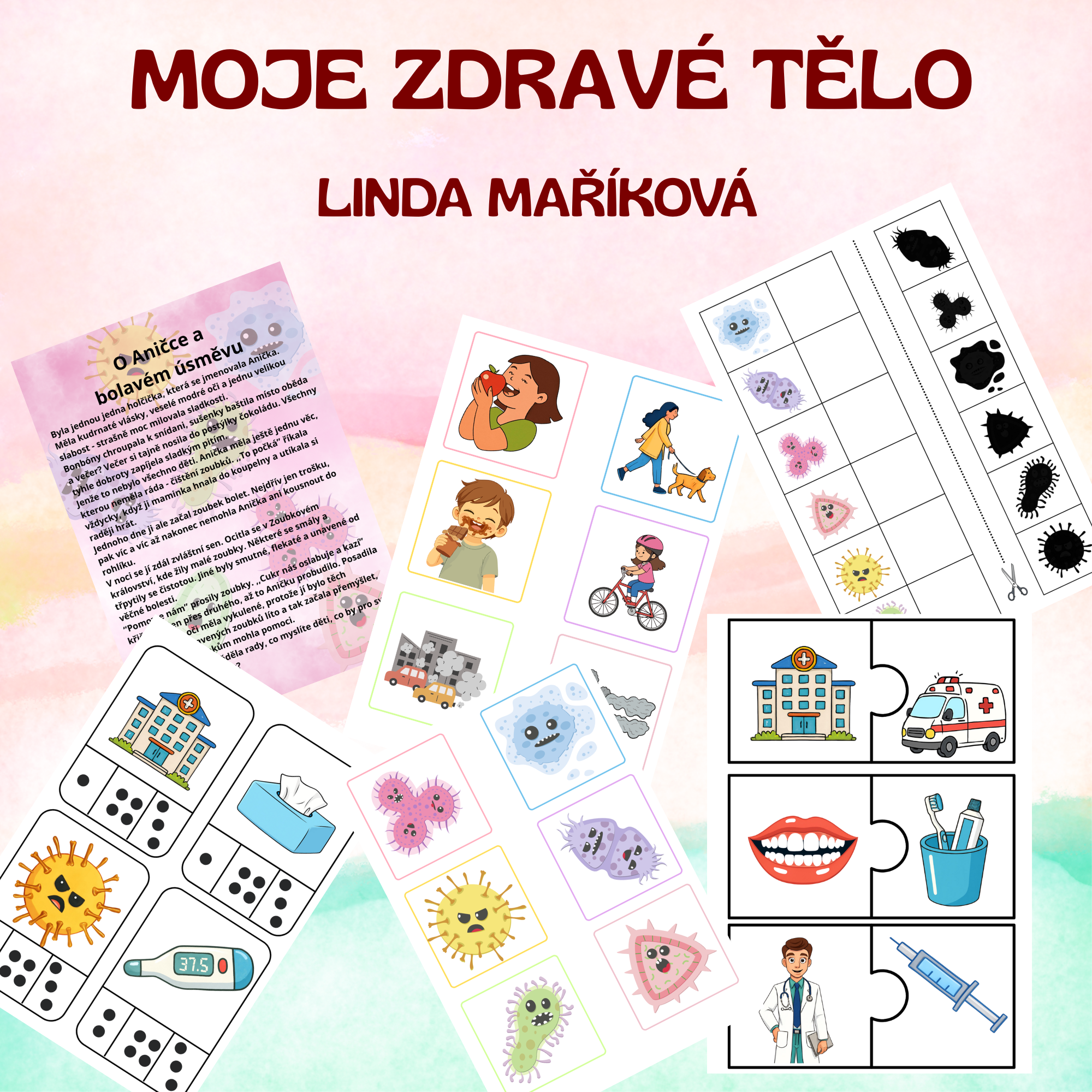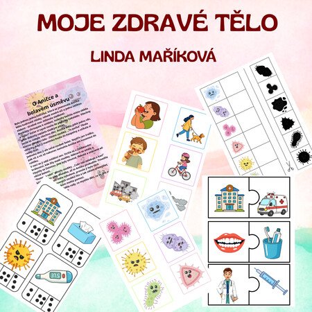 Moje zdravé tělo - tento soubor je vytvořen k tématu zdravého těla. Aktivity jsou voleny tak, aby vyhovovaly dětem ve věku 3 - 7 let. Především jsou to pomůcky, které využívám v centrech aktivit, ale lze je využít jakkoli.