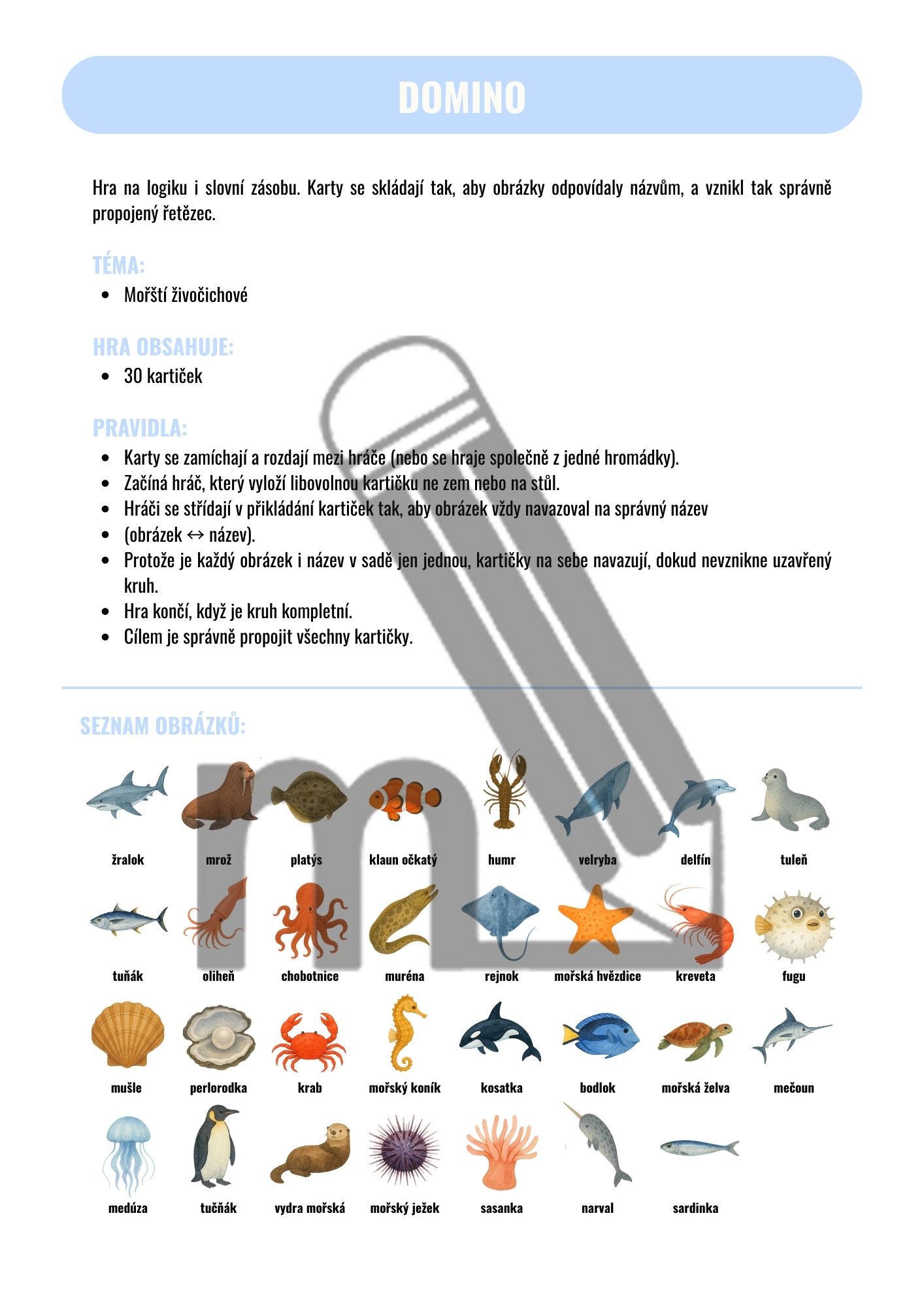 Hra na logiku i slovní zásobu. Karty se skládají tak, aby obrázky odpovídaly názvům, a vznikl tak správně propojený řetězec.