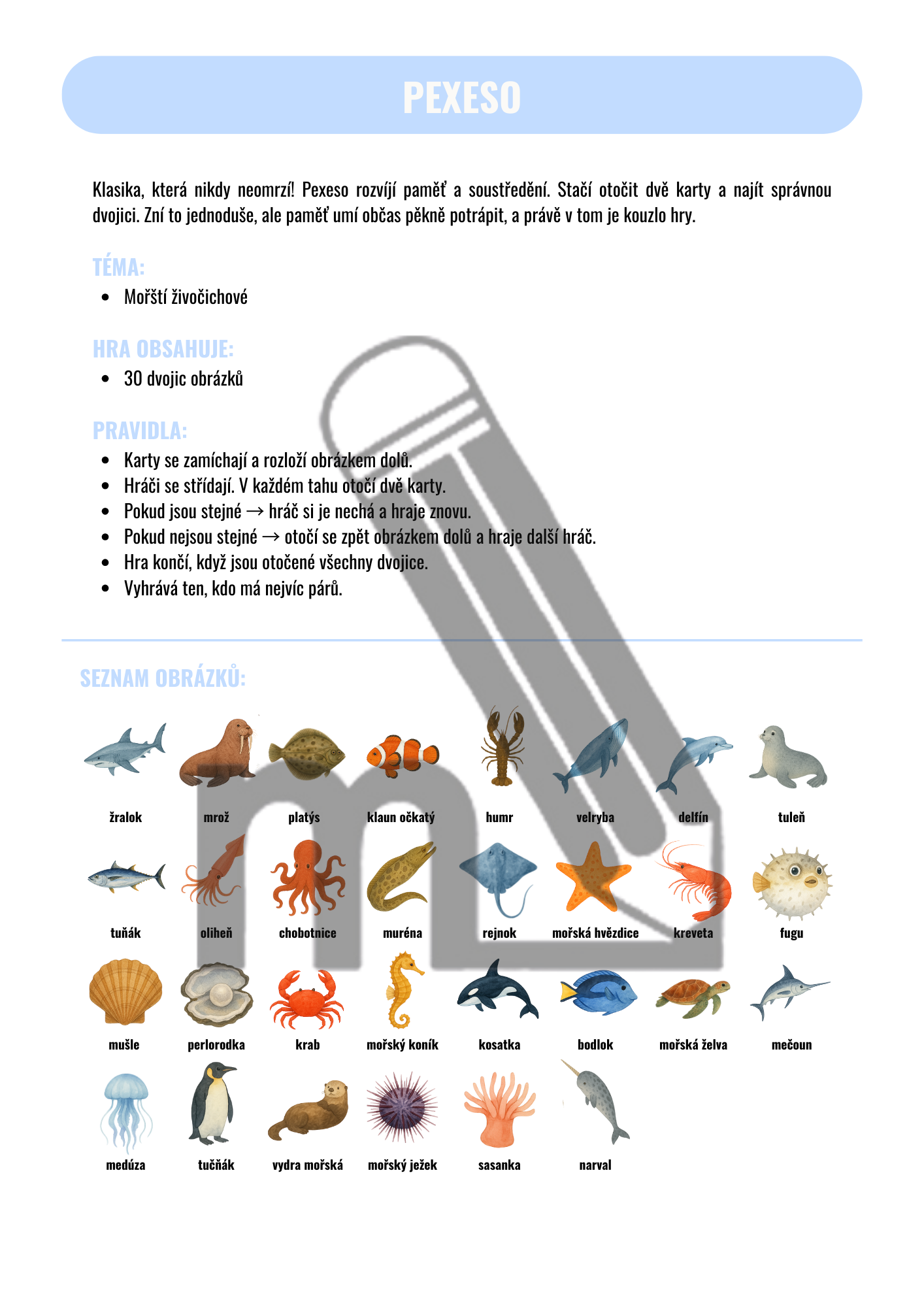 Klasika, která nikdy neomrzí! Pexeso rozvíjí paměť a soustředění. Stačí otočit dvě karty a najít správnou dvojici. Zní to jednoduše, ale paměť umí občas pěkně potrápit, a právě v tom je kouzlo hry.