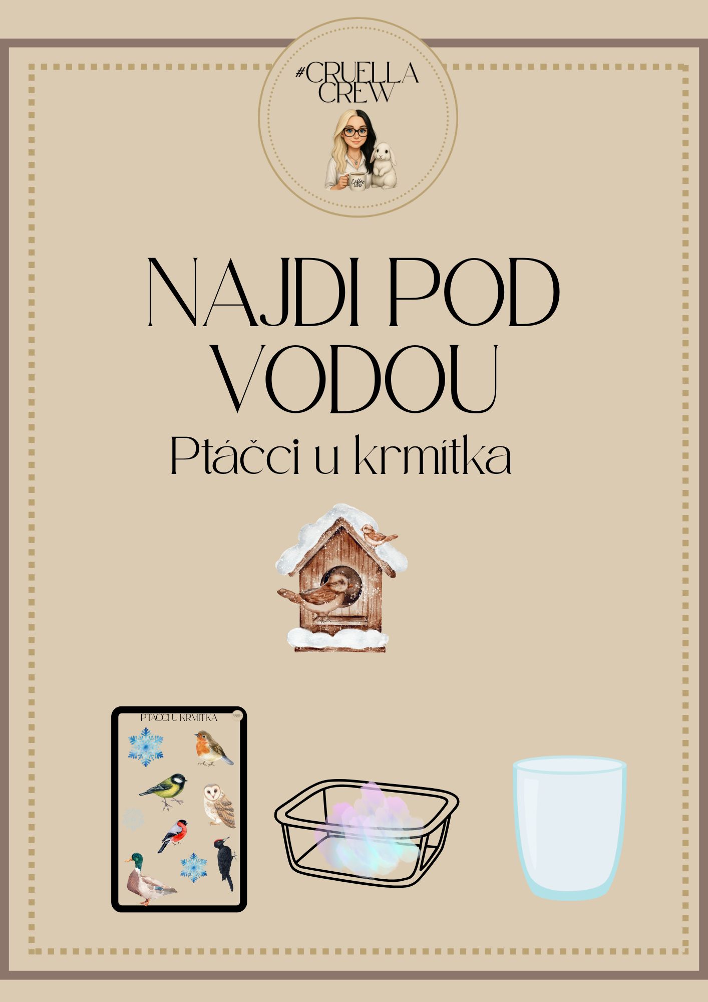 Vytiskněte si oba pracovní listy. Připravte si průhledný box, nebo nejlépe skleněnou mísu/pekáč. Pod box - pekáč vložte papír jen s obrázky. Do pekáče/boxu dejte max do ⅓ vodu, tu obarvěte trochou tempery. Vložte sklenici dnem dolů, dítě hledá obrázky a na druhý pracovní list značí křížkem, co našlo za obrázek