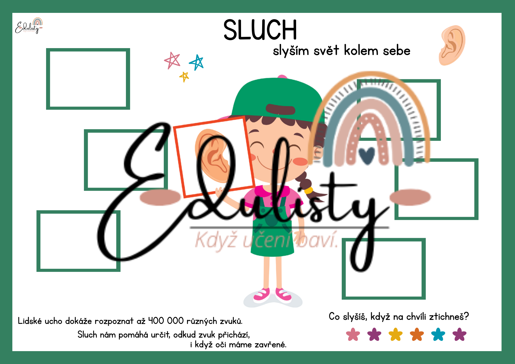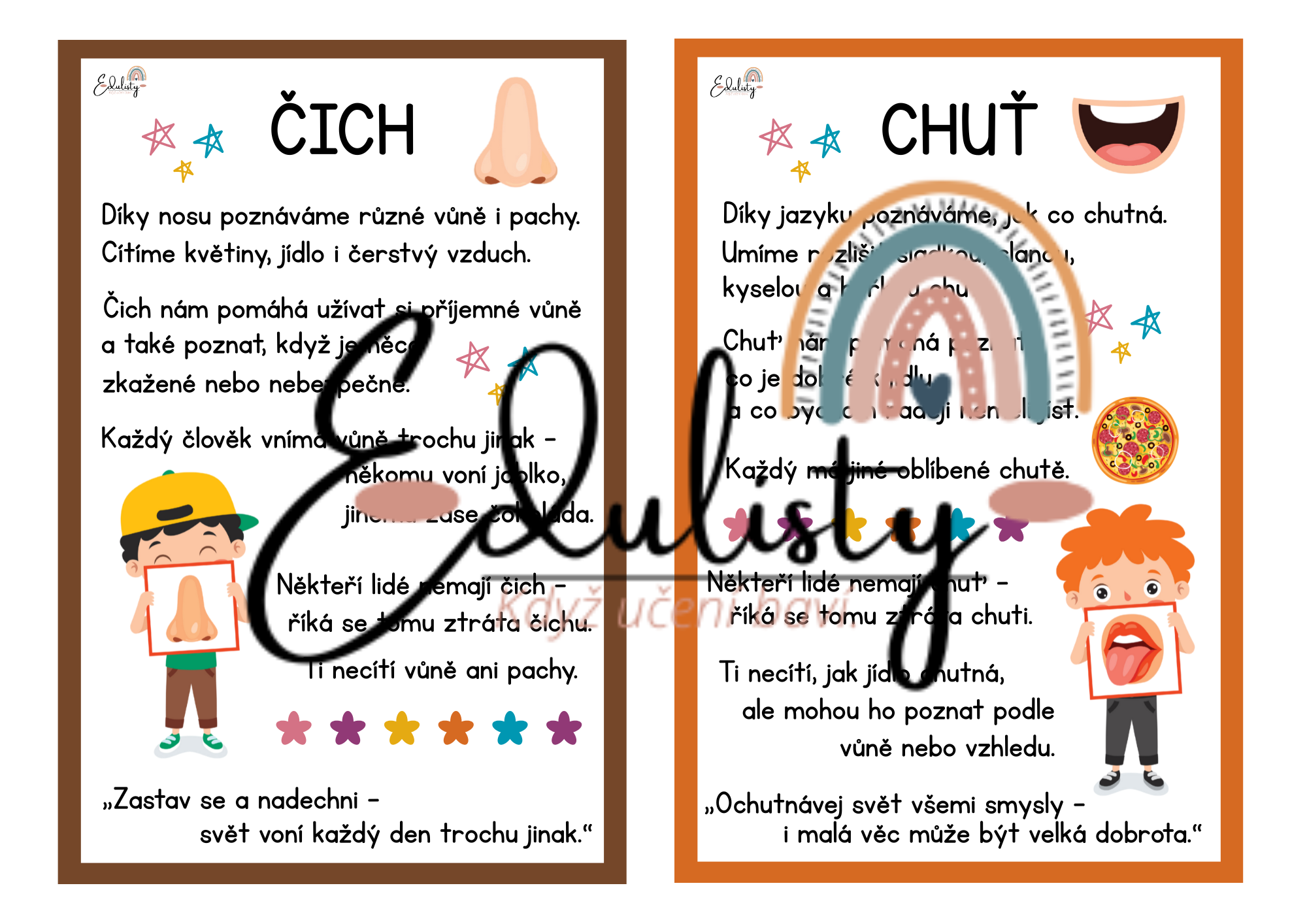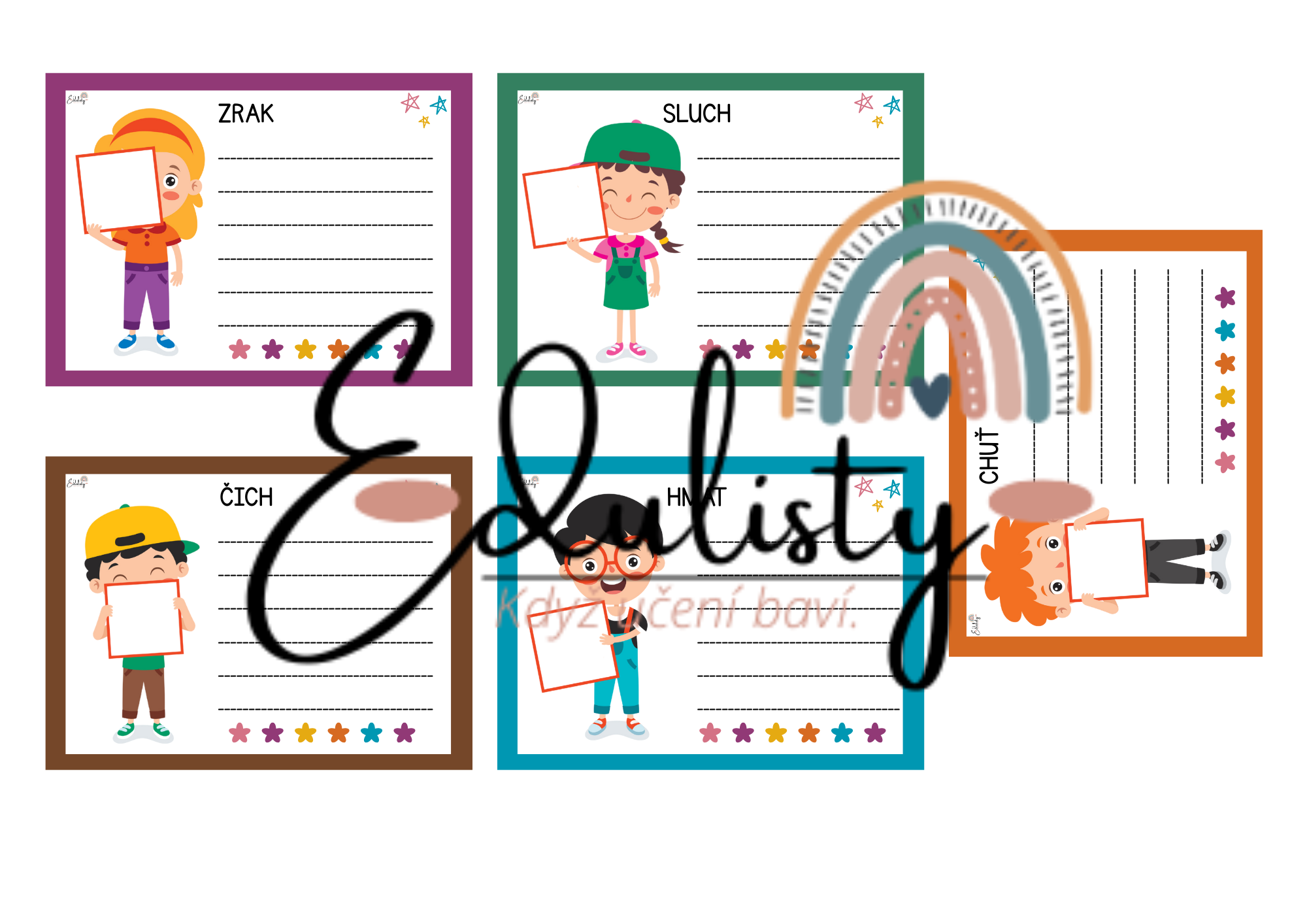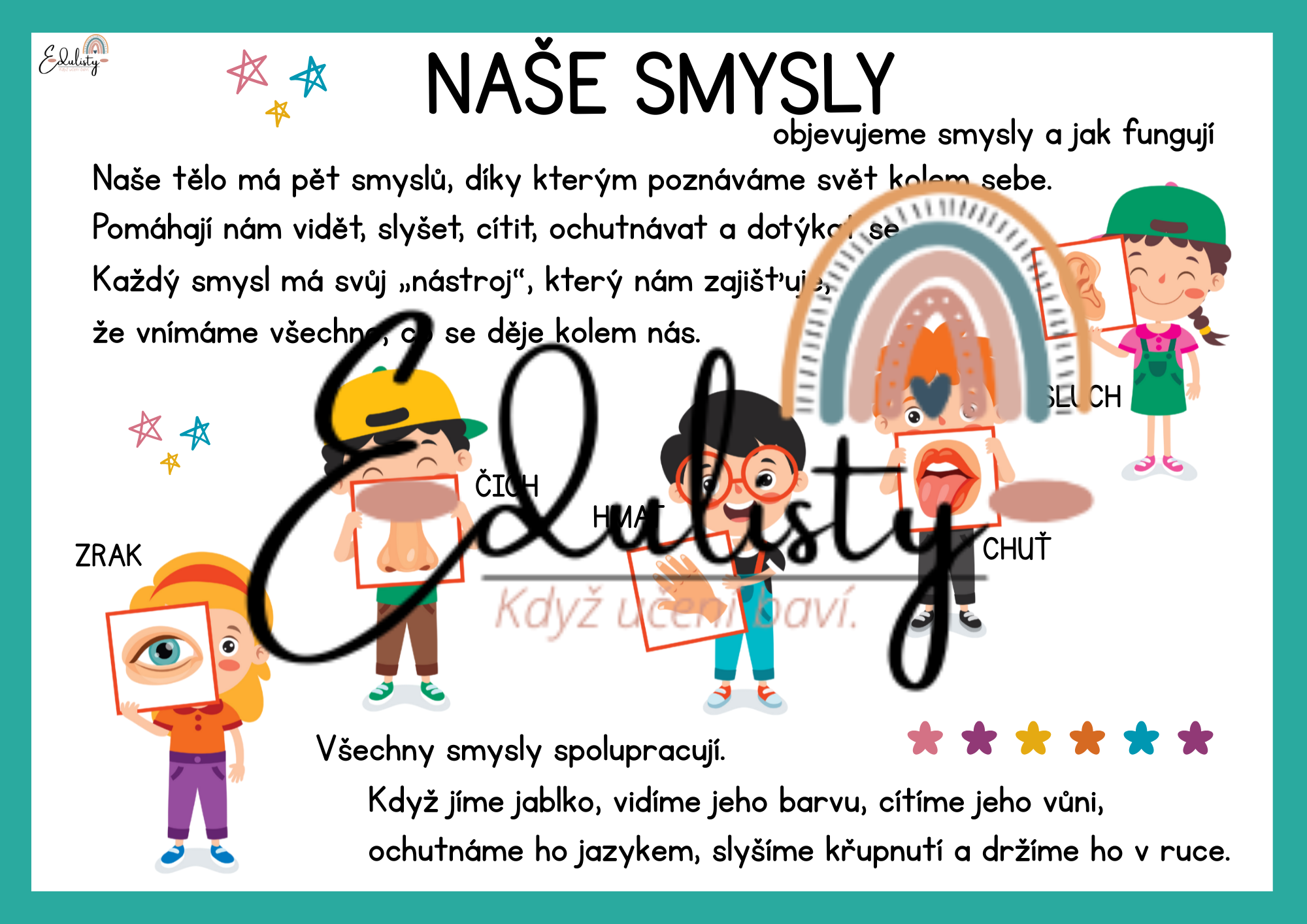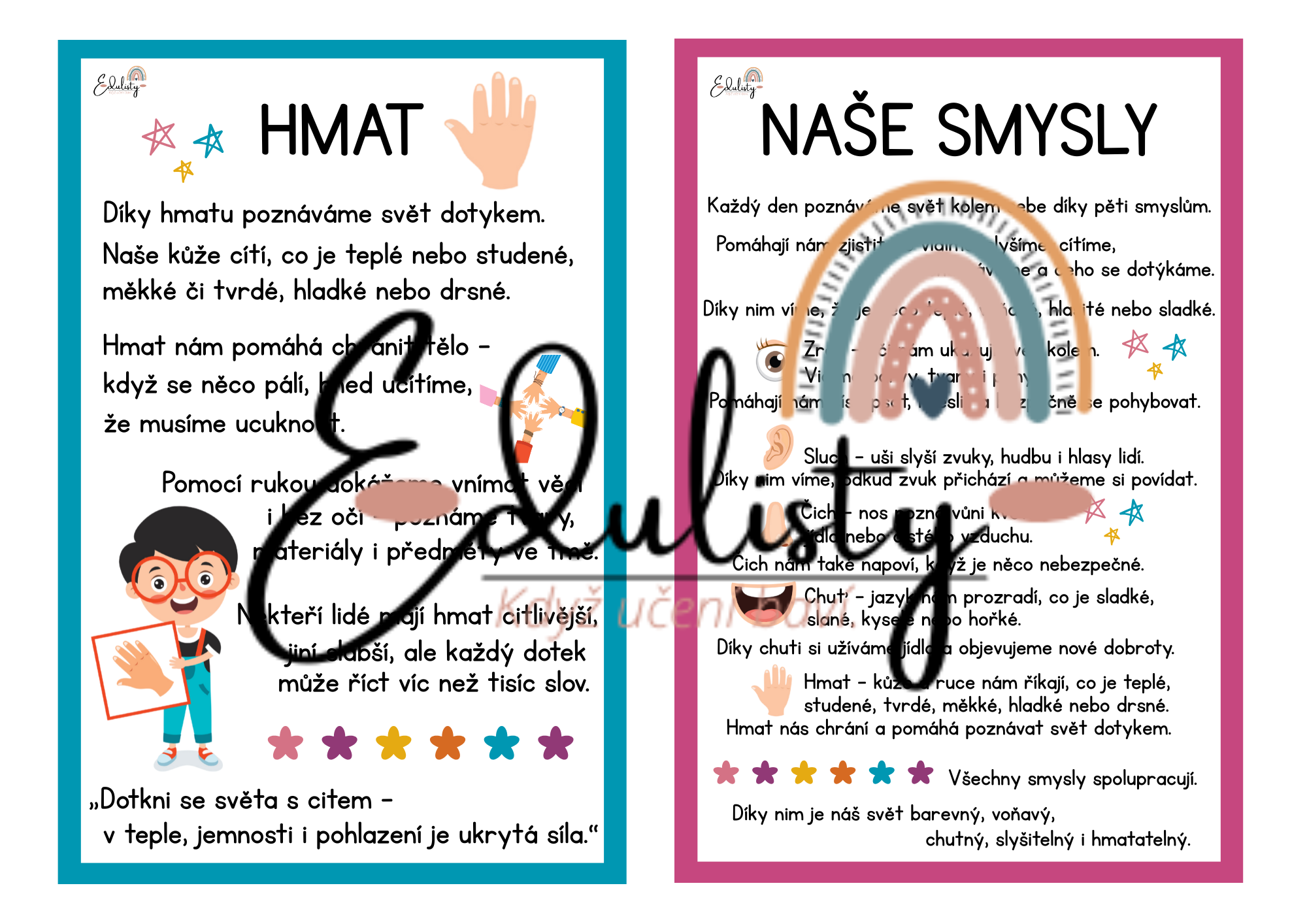 – 5 menších tematických plakátů – zrak, sluch, čich, chuť, hmat (každý s popisem, příklady a ilustracemi)