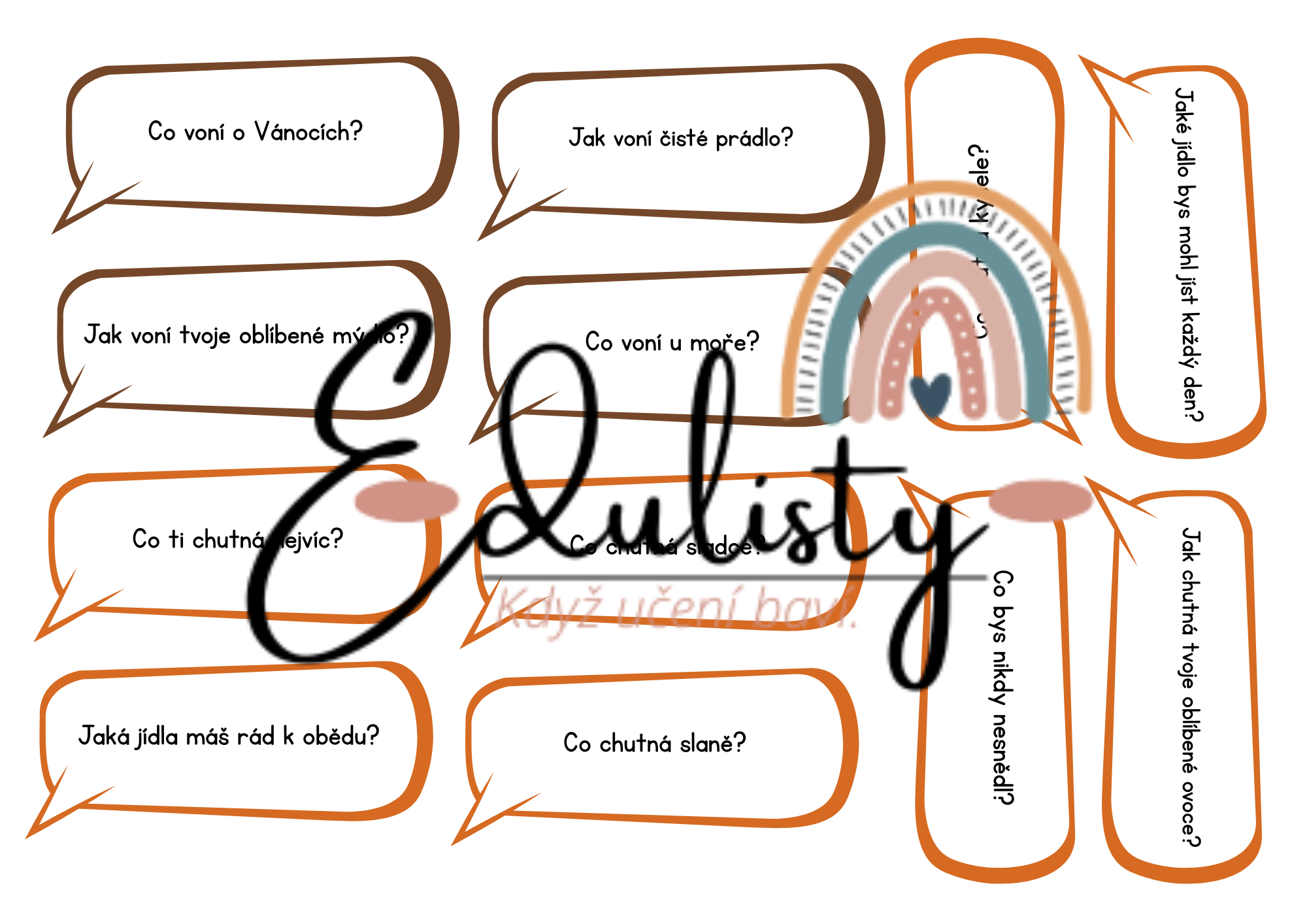 – otevřené otázky ke každému smyslu (např. „Co všechno můžeme vidět?“, „Jak voní domov?“ apod.)