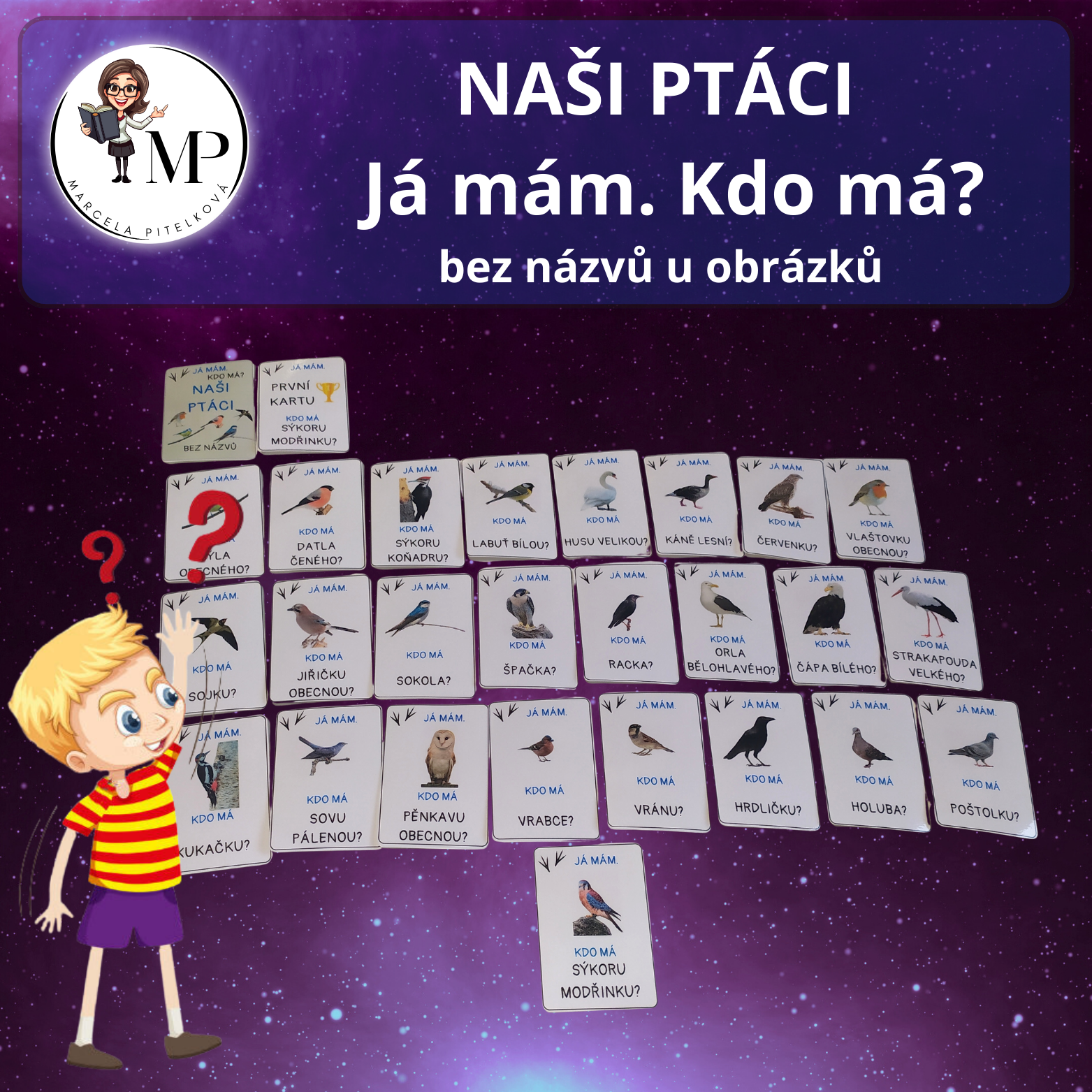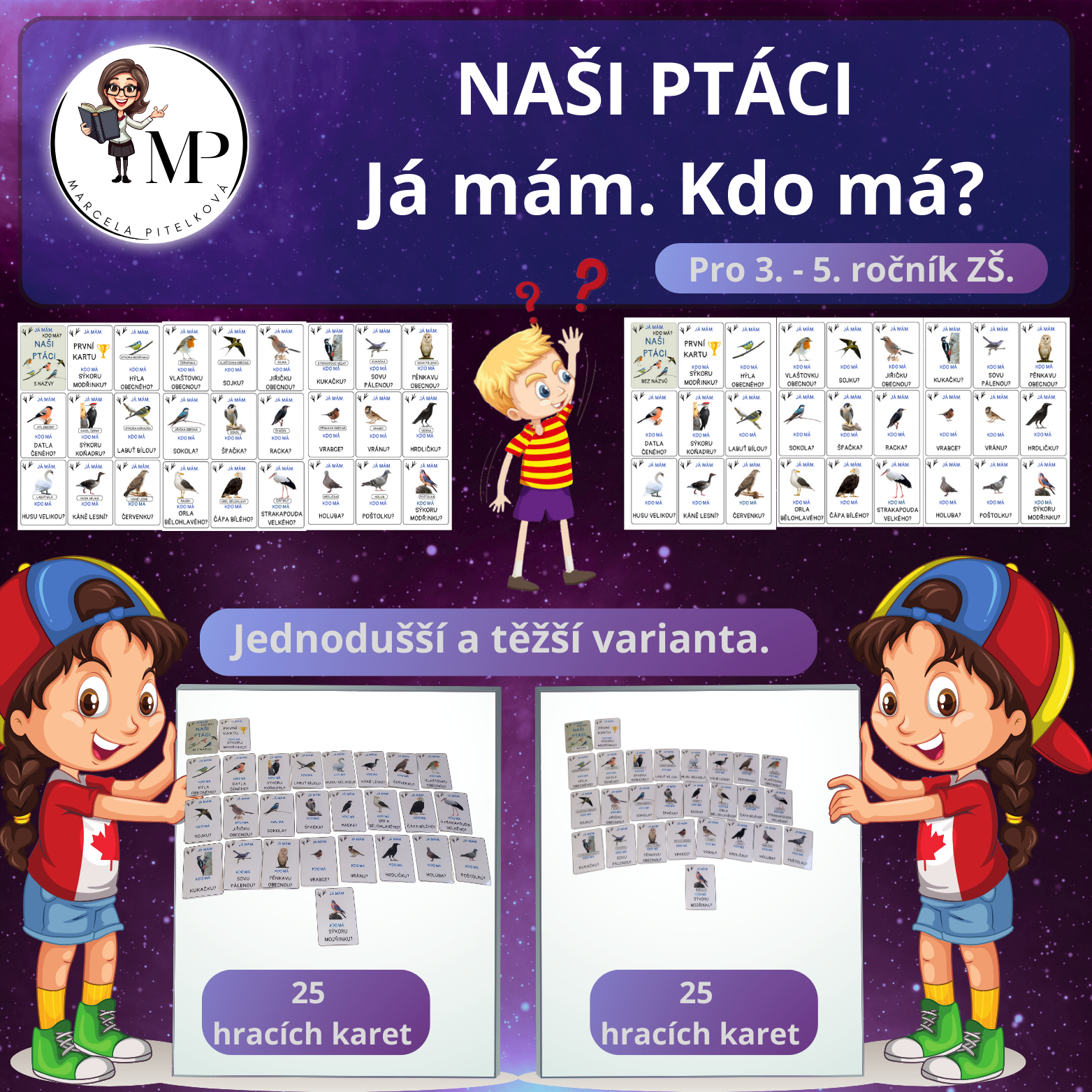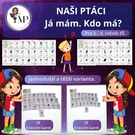 Soubor obsahuje dvě varianty hry. Lehčí variantu, ve které jsou u obrázků názvy ptáků a těžší variantu, kdy u obrázků nejsou napsané názvy ptáků.