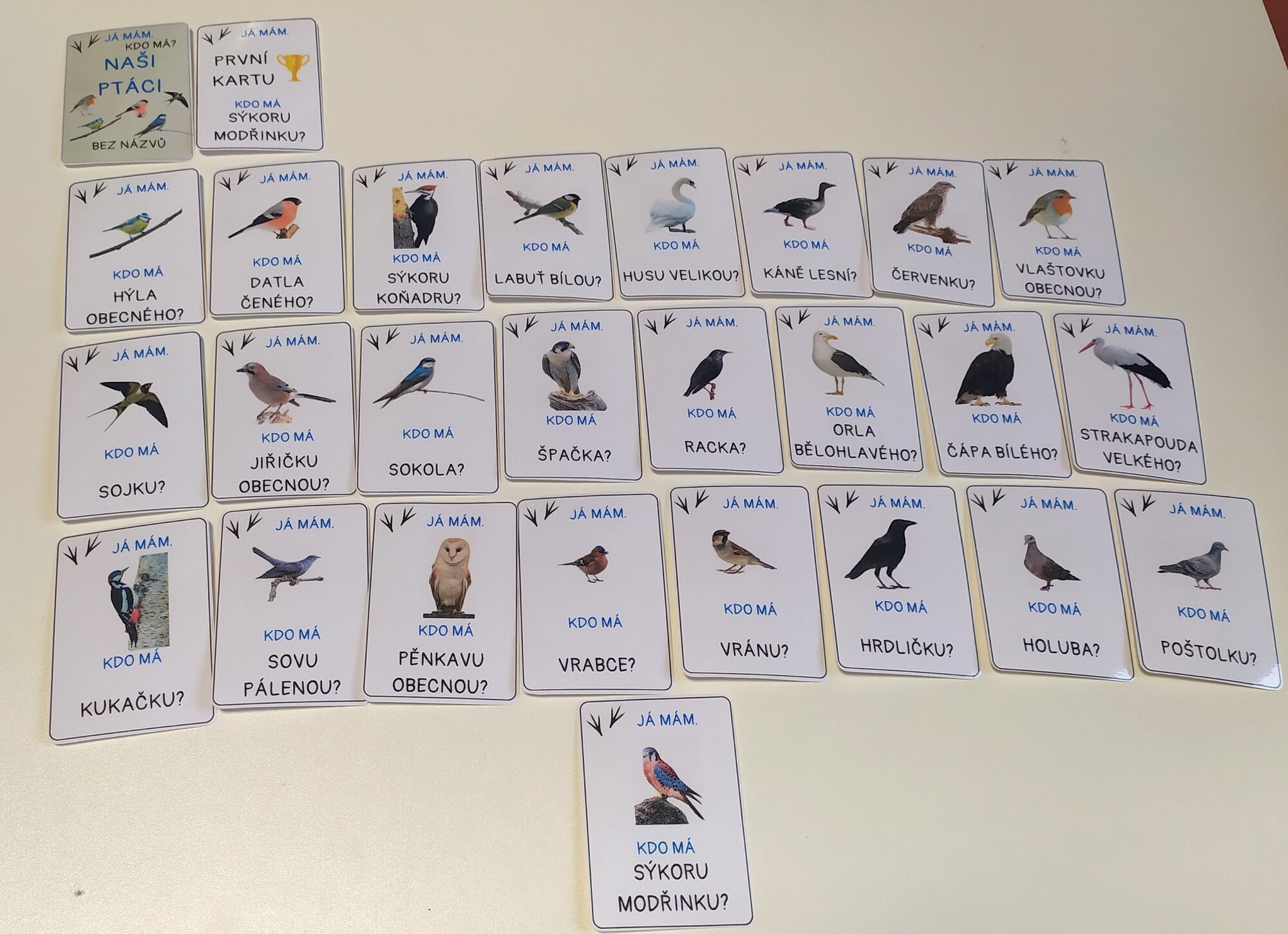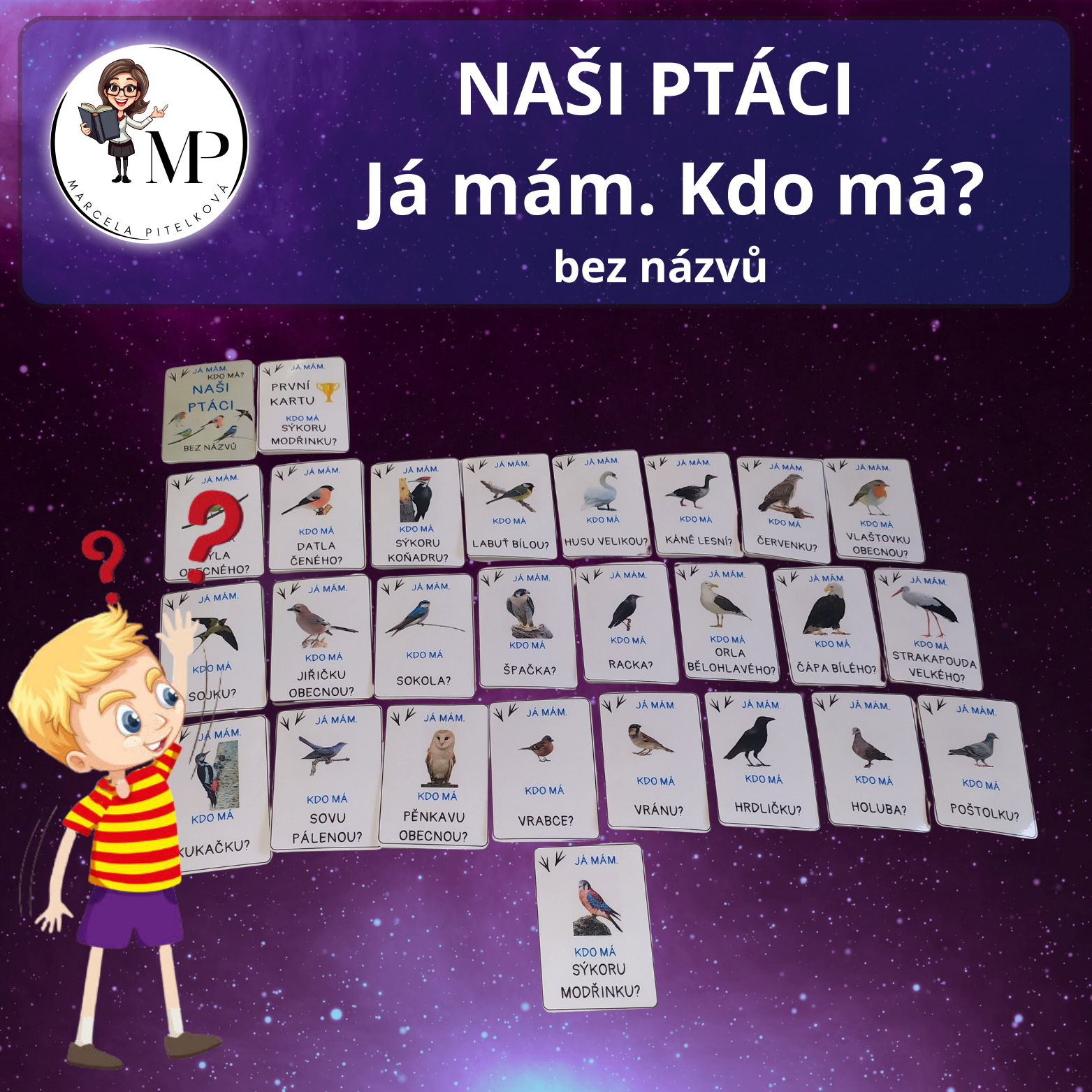 Téma Naši ptáci - ptáčci bez názvů u obrázků. Sada koncipovaná jako aktivita JÁ MÁM, KDO MÁ. Vhodné do prvouky a přírodovědy na 1. stupni ZŠ.