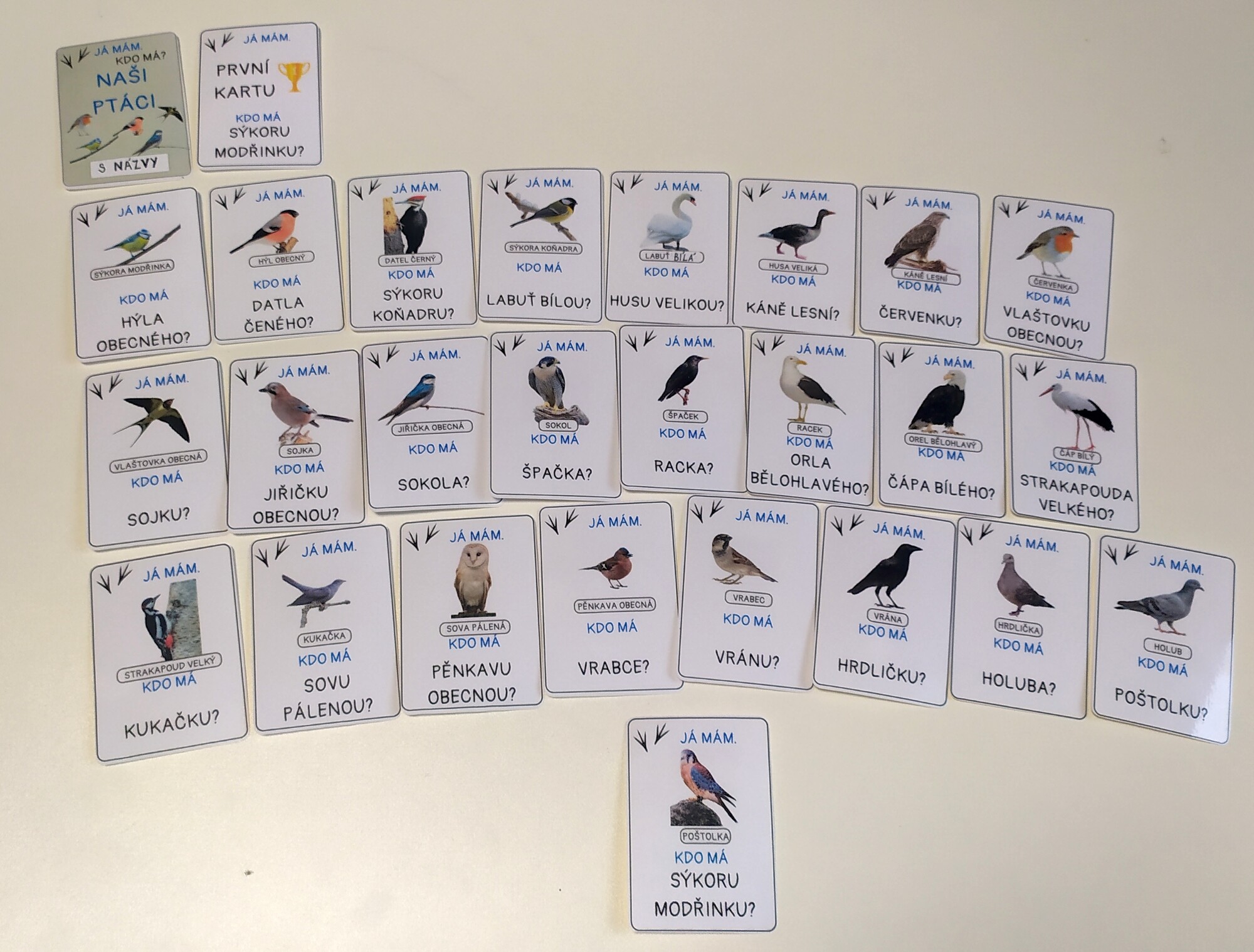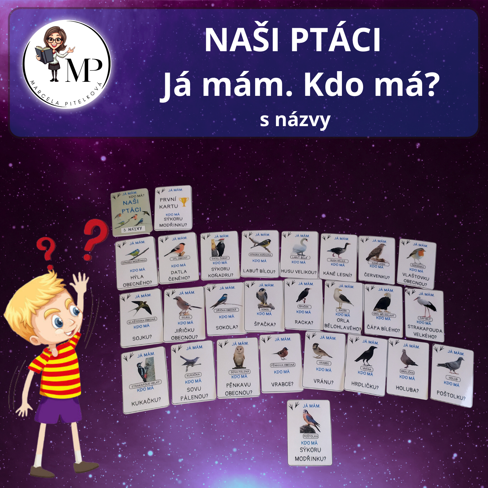 Téma Naši ptáci - ptáčci s názvy u obrázků. Sada koncipovaná jako aktivita JÁ MÁM, KDO MÁ. Vhodné do prvouky a přírodovědy na 1. stupni ZŠ.