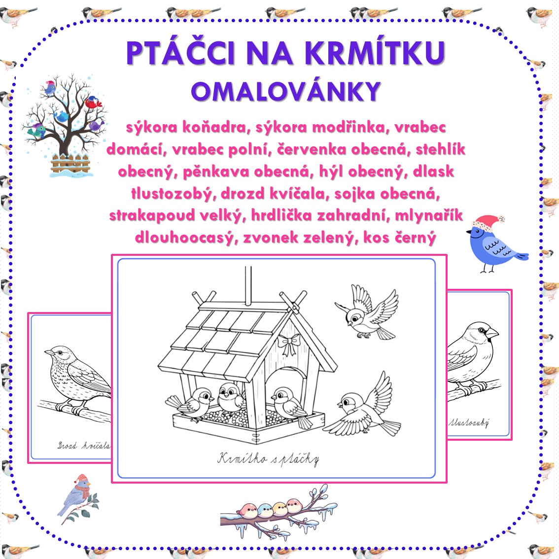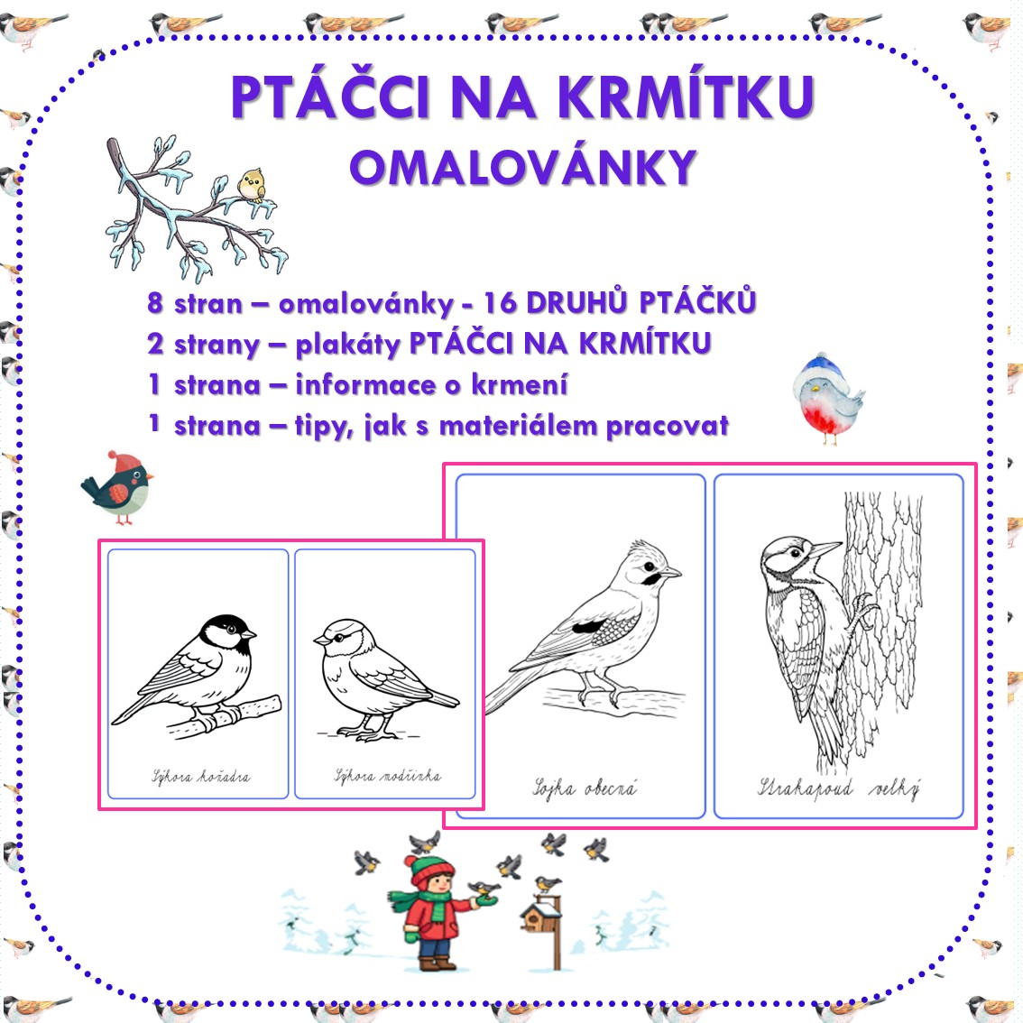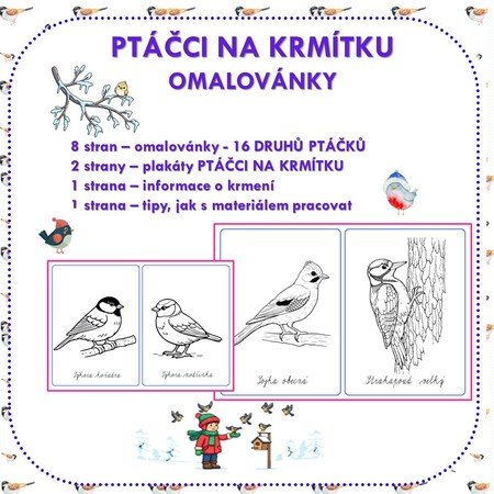 · 8 stran – omalovánky (vyobrazeno 16 druhů ptáčků)