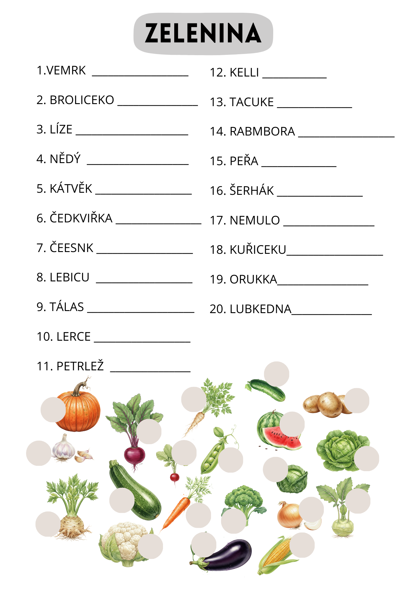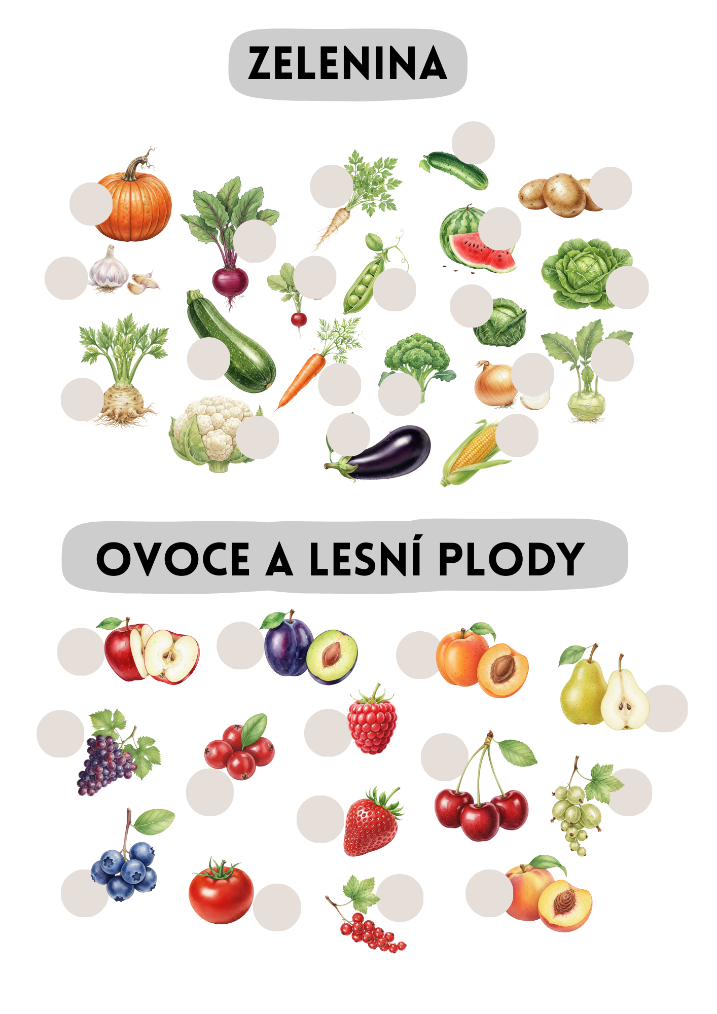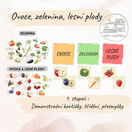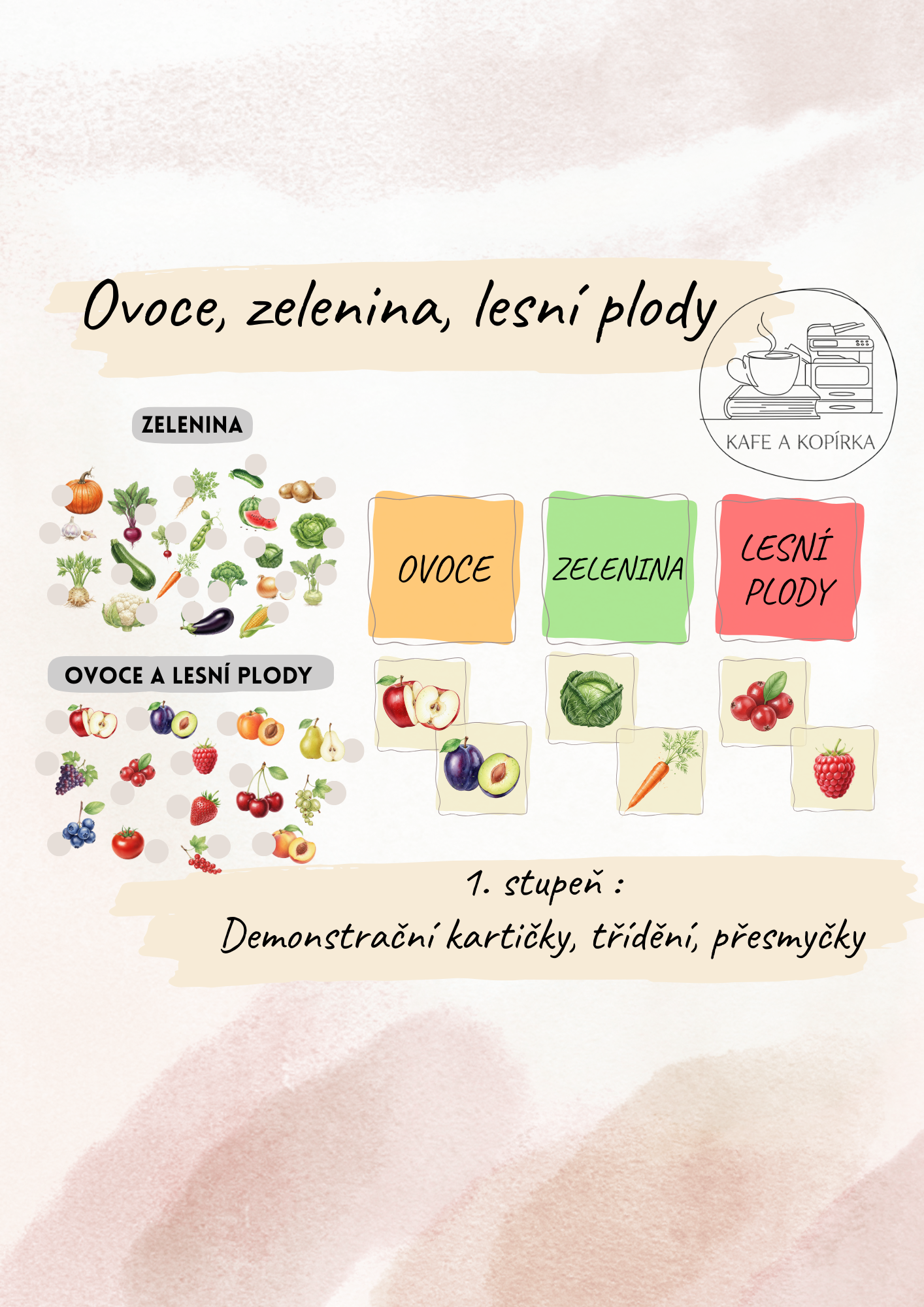 Materiál obsahuje demonstrační kartičky - ovoce, zelenina, lesní plodiny. Materiál slouží k seznámení a třídění plodin. Obsahuje také pracovní listy na procvičování - přesmyčky. Materiál je určen primárně pro 1. stupeň.