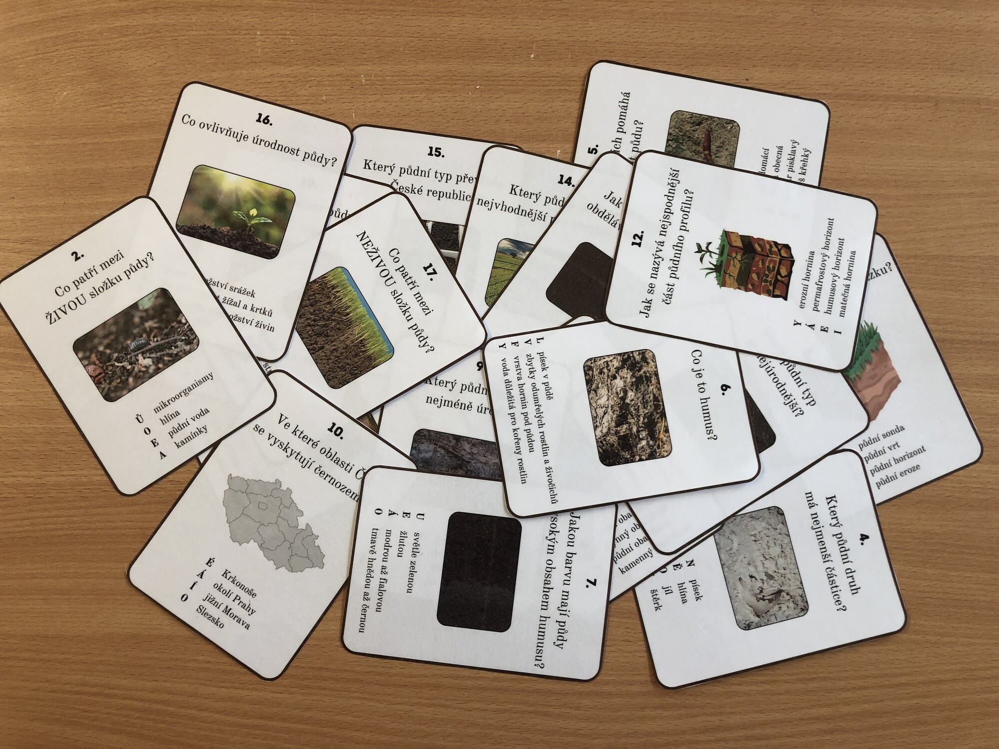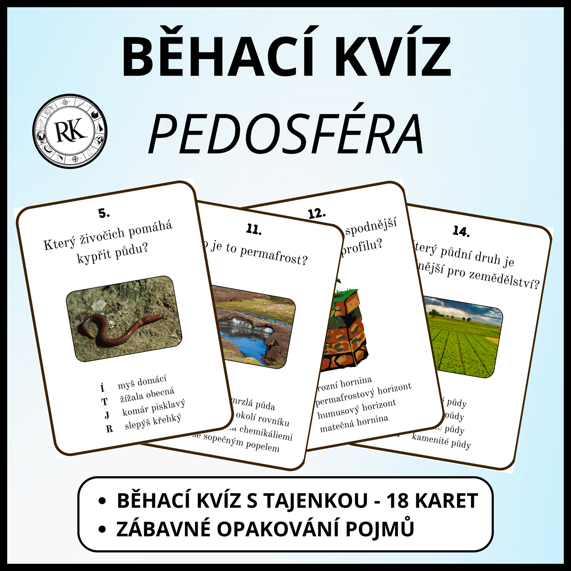 Vzdělávací materiál obsahuje 18 karet k opakování základních znalostí o pedosféře a kartu pro zápis tajenky. Doporučuji opakovací karty vytisknout, zalaminovat a rozstříhat.