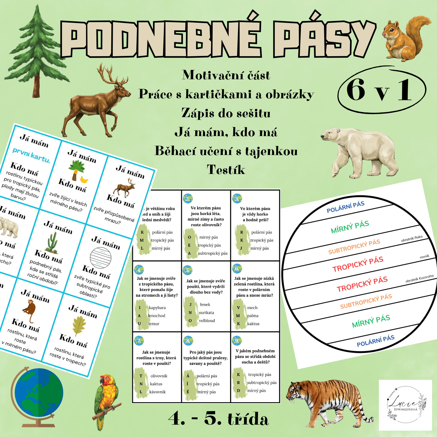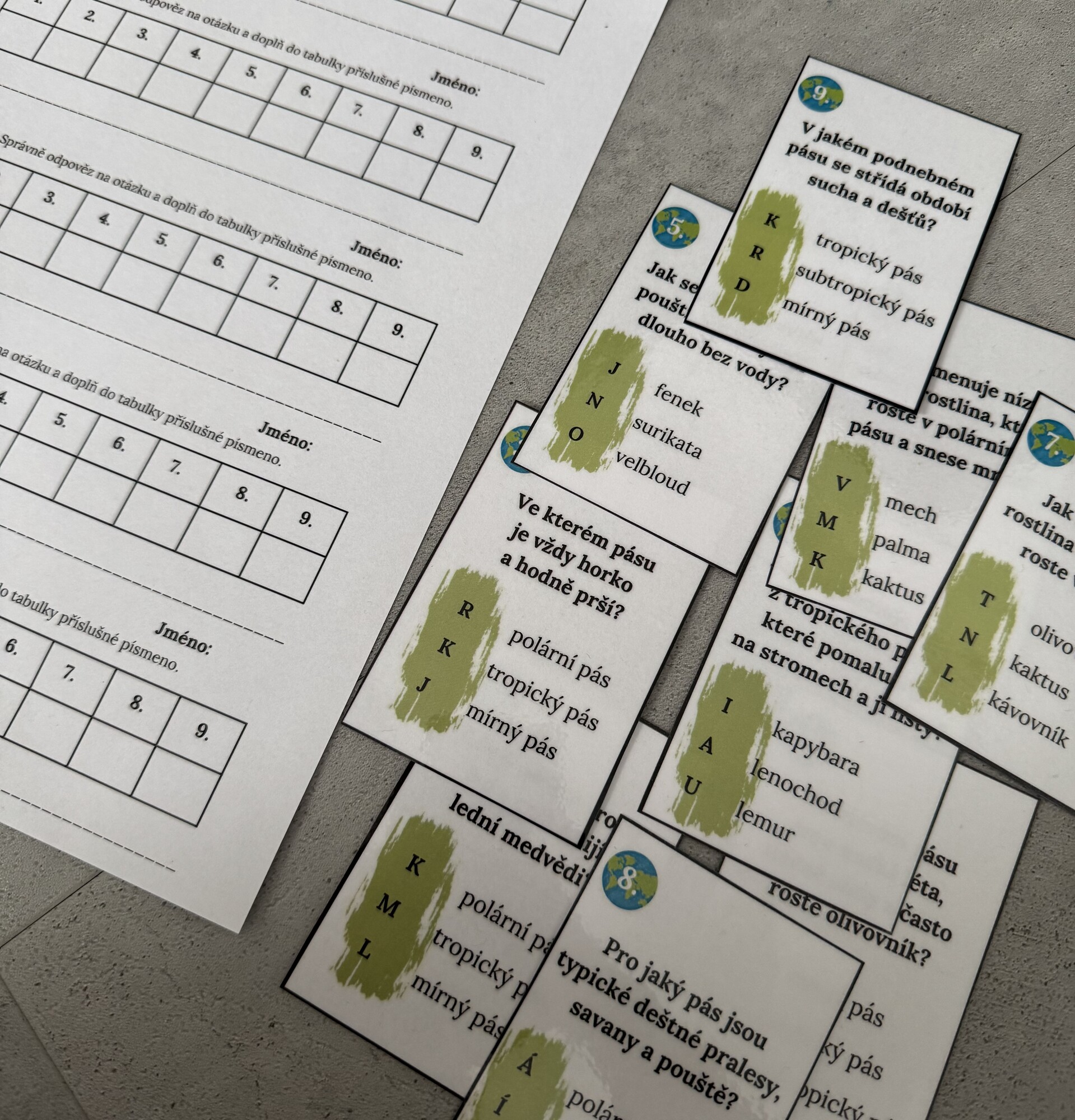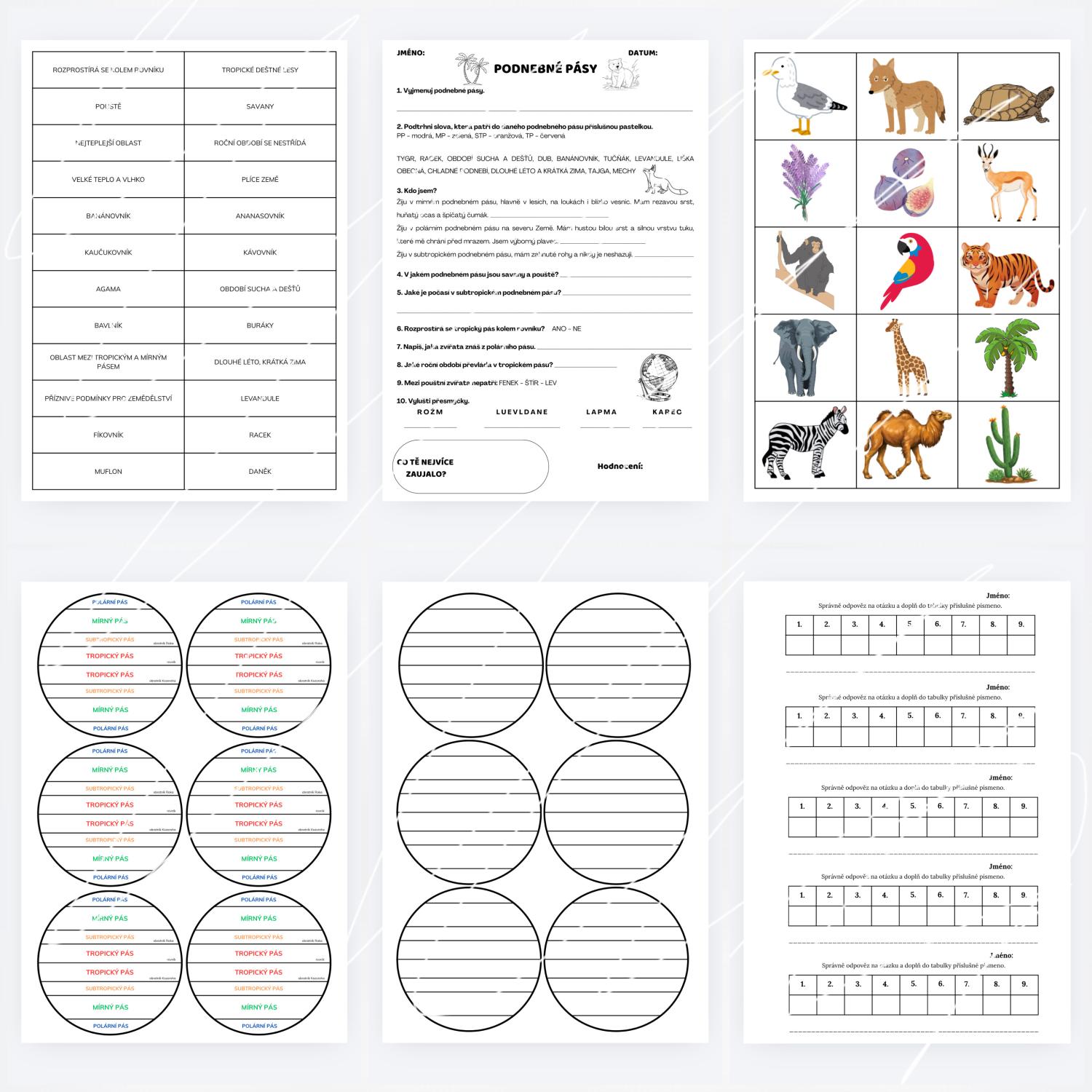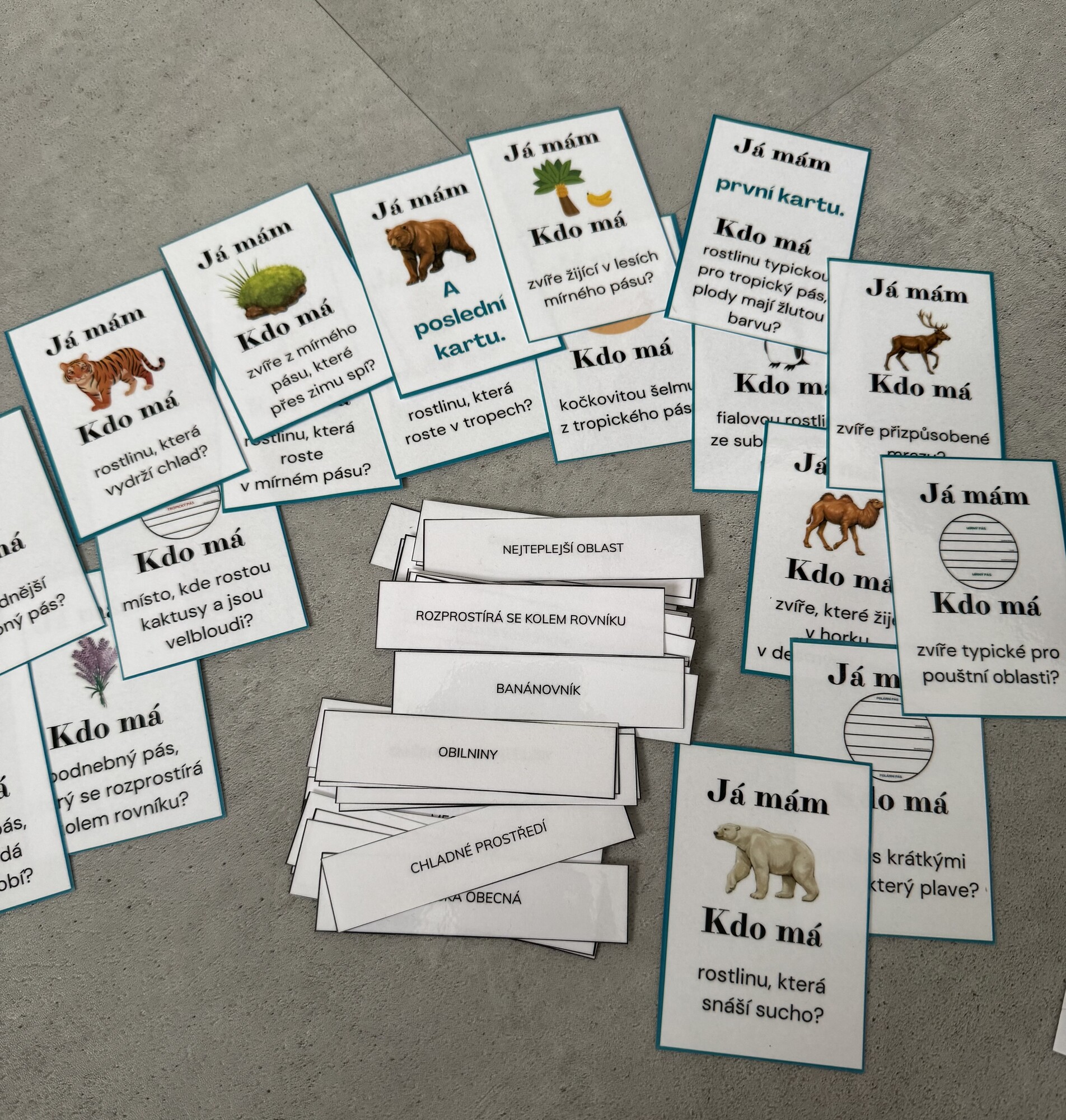 48 kartiček s typickými znaky podnebných pásů, rostlinami a živočichy