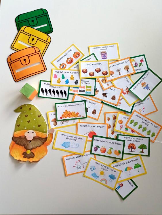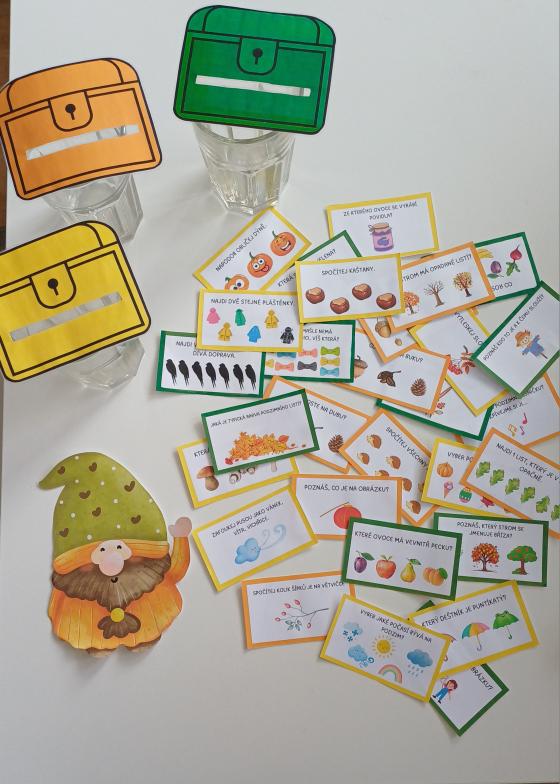 Pomůžete splnit Podzimníčkovi všechny úkoly a roztřídit je do správné bedýnky podle barev? Ta bedýnka, která bude nejdříve plná úkolů, vyhrává! :-) Bedýnce veprostřed vystříhněte otvor, kudy se budou karty házet (naznačená čára) a připevněte ji např. na kelímek nebo sklenici.
