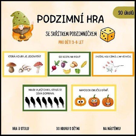 Vítejte v kouzelné hře skřítka Podzimníčka! Tento malý neposeda si pro vás připravil 30 podzimních hádanek a úkolů, u kterých se nejen něco naučíte, ale také se společně pobavíte a když budete chtít, tak i zasoutěžíte :-)!