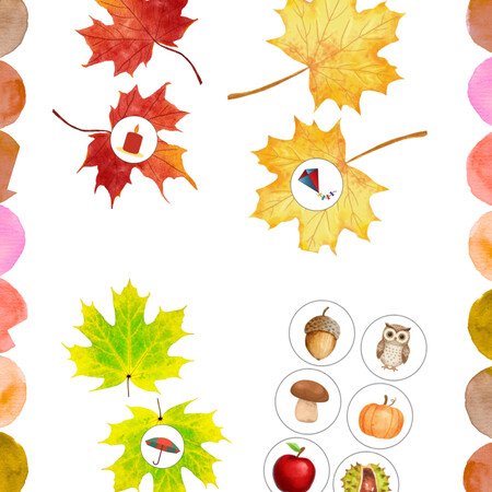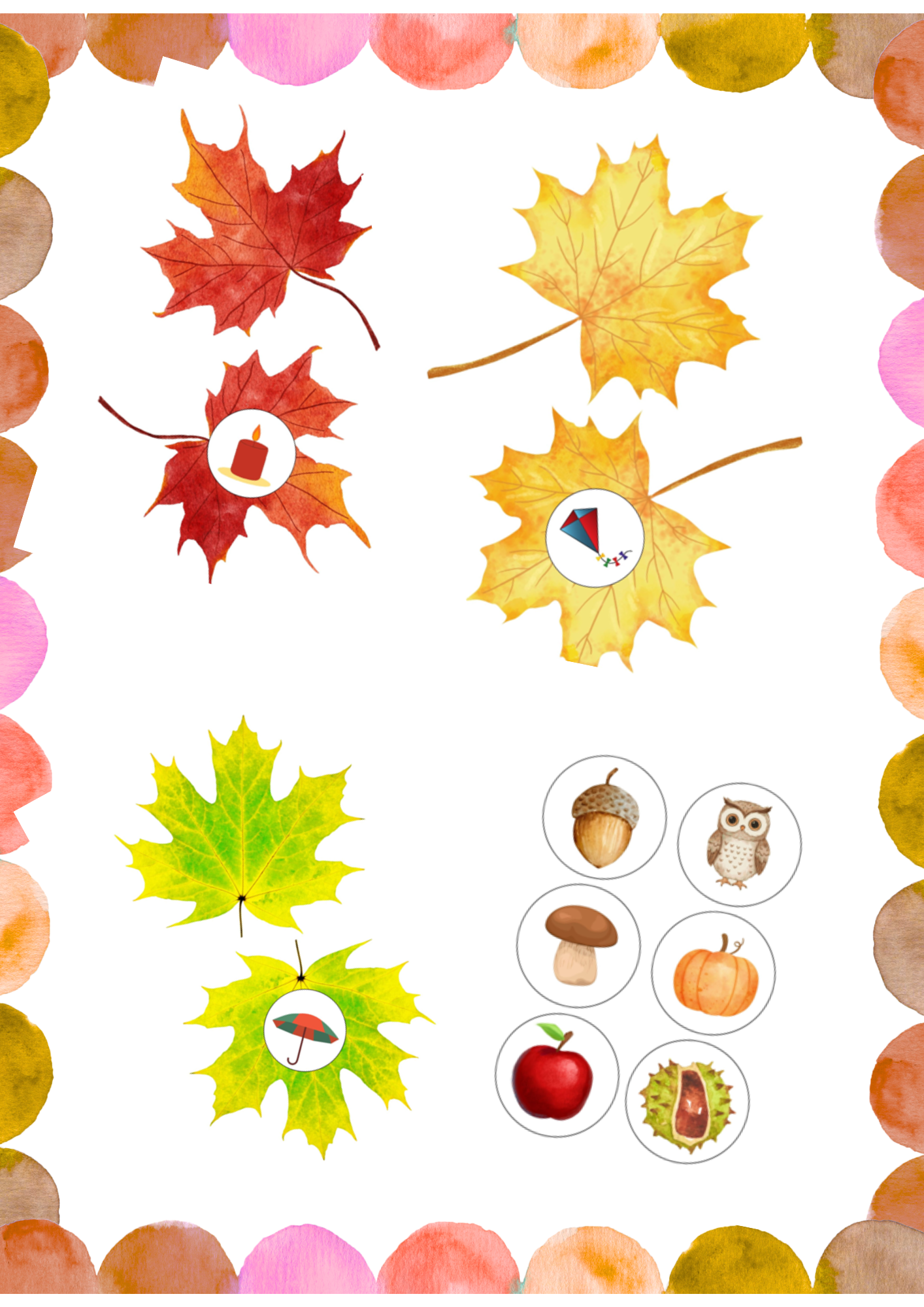 Soubor s podzimní prosvětlovačkou obsahuje 12 stránek s listy, které obsahují různé symboly podzimu (žalud, kaštan, gumáky, deštník, svíčka, sova, veverka, ježek, jablko, dýně, jablko, drak).