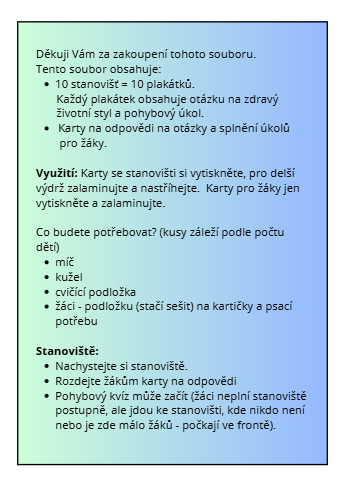 Využití: Karty se stanovišti si vytiskněte, pro delší výdrž zalaminujte a nastříhejte. Karty pro žáky jen vytiskněte a zalaminujte.