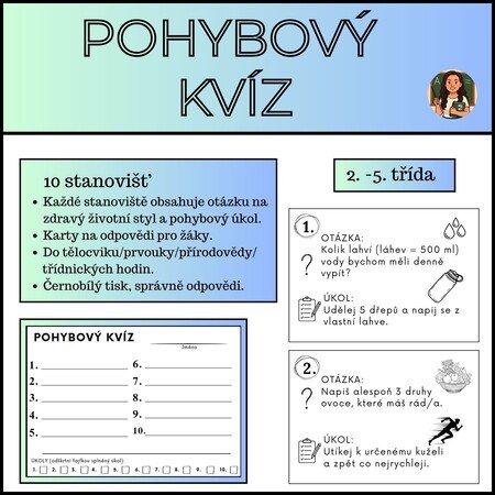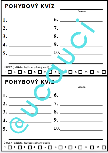 - Pohybový kvíz může začít (žáci neplní stanoviště postupně, ale jdou ke stanovišti, kde nikdo není nebo je zde málo žáků - počkají ve frontě).