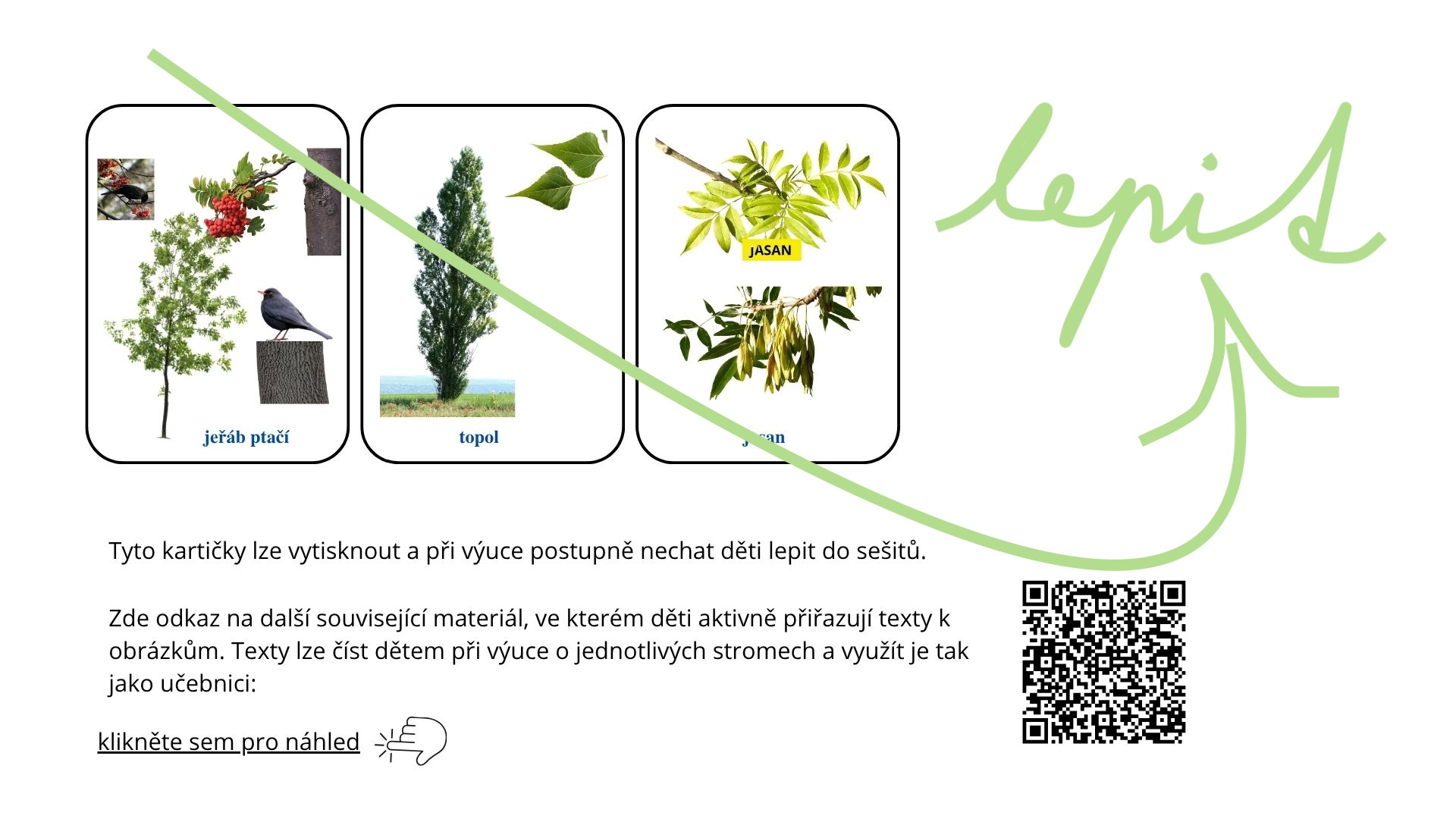Součástí dokumentu jsou také kartičky se stromy, které lze vytisknout a použít při výuce – například k lepení do sešitů, přiřazování nebo poznávacích hrách. Učitelé mohou žákům nabídnout také propojený materiál dostupný na webu PrimaUča.cz, který rozšiřuje práci o aktivní přiřazování textů k obrázkům a čtení o jednotlivých druzích stromů. Odkaz je přiložen na jednom z listů v souboru.